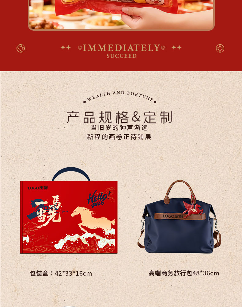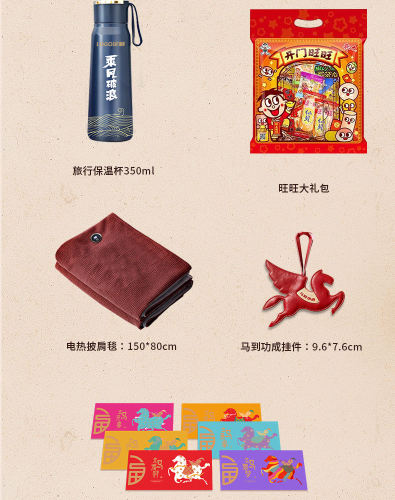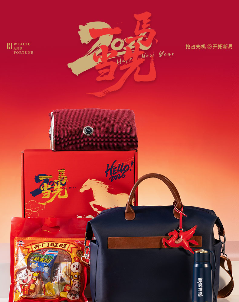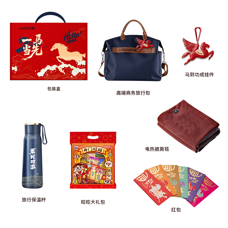 • 商务旅行包装下出行所需 • 专属飞马钥匙扣挂于包上,每一次出发都有好运随行 • 乘风破浪保温杯,旅途中总有暖意相伴 • 借“旺”的好彩头,为孩子、为全家加持一整年的好运,愿新岁事事顺、样样旺 •加热毛毯披肩,是关怀的核心——它不止是抵御寒意的物件,更是企业把“心疼你旅途辛苦”的心意织进面料里 •多功能呵护眼罩与枕颈,缓解奔波疲惫,让每段旅程都有舒适依靠 • 6个红包藏满新年期许