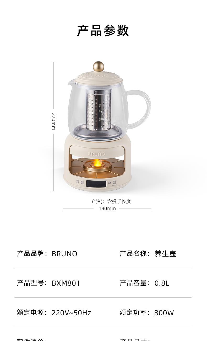 产品型号:BXM801 产品颜色:白 产品功率:800W 额定电压:220V~50Hz 产品容量:0.8L; 产品尺寸:190*270*154mm 净重:1.15Kg 毛重:2kg 主要功能:烧水;花茶;参茶;调奶;慢炖;精煮;预约、保温 标配:玻璃壶*1、壶盖*1、底座*1、说明书*1 其他配置:茶漏款;茶漏+炖盅款