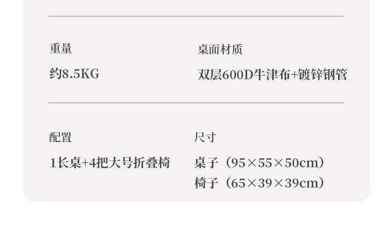 材质:600D双层牛津布 +镀锌合计钢管 商品颜色:茶松棕 商品规格:五件套(一桌四椅) 桌子尺寸:95*55*50cm 椅子尺寸:65*39*39cm 商品重量:10kg 商品承重:120kg 需要同款长桌三件套一桌两椅的,可以联系我司业务 1、升级合金钢加长桌面,防水耐腐蚀; 2、加大号便携折叠椅,久坐不累; 3、一桌多椅,折叠收纳,不占空间 ; 4、高承重,高负荷,舒适享受; 5、轻奢配色,贴近自然;