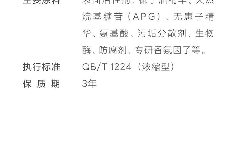 产品货号:219863 产品规格:330g/瓶 主要原料:表面活性剂、椰子油精华、天然烷基糖苷(APG)、无患子精华、氨基酸 保质期:3年