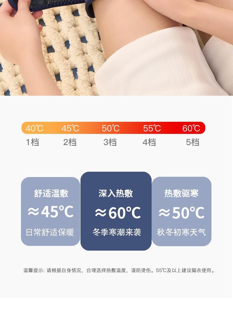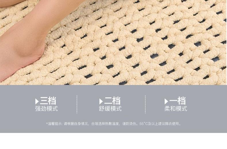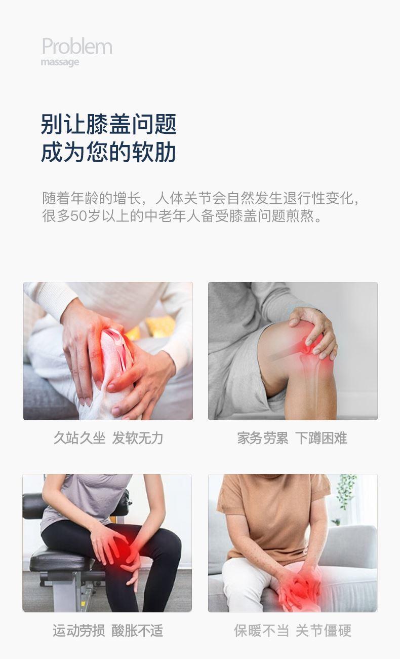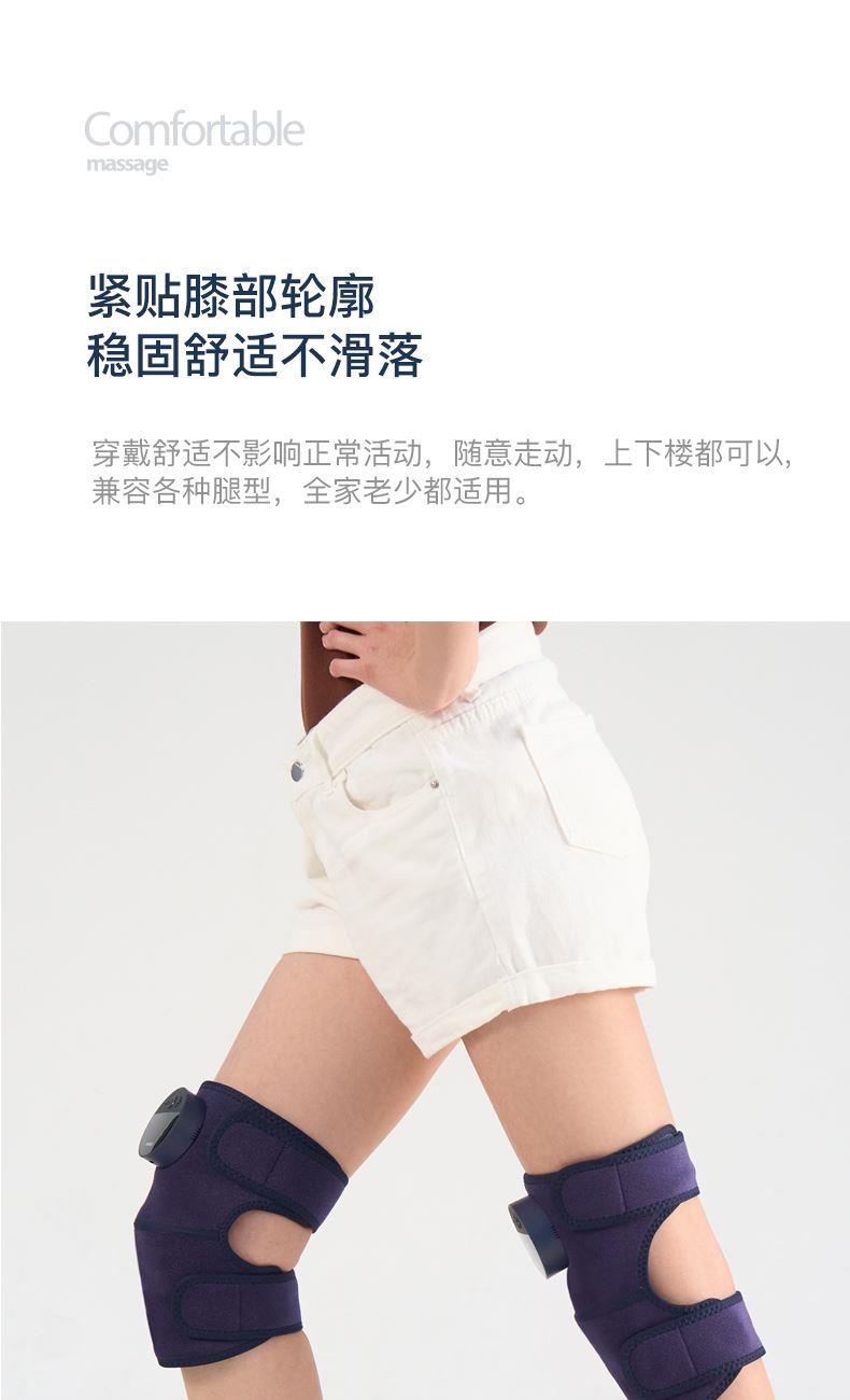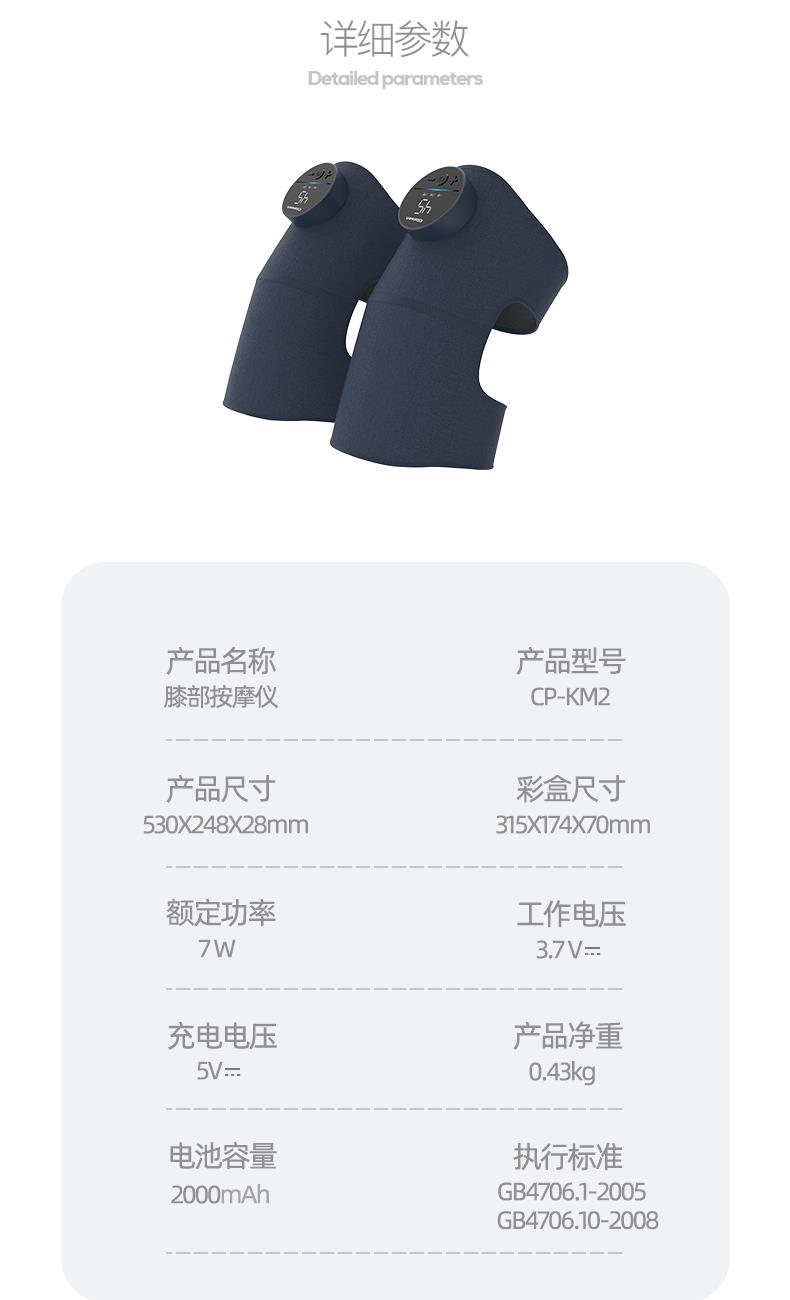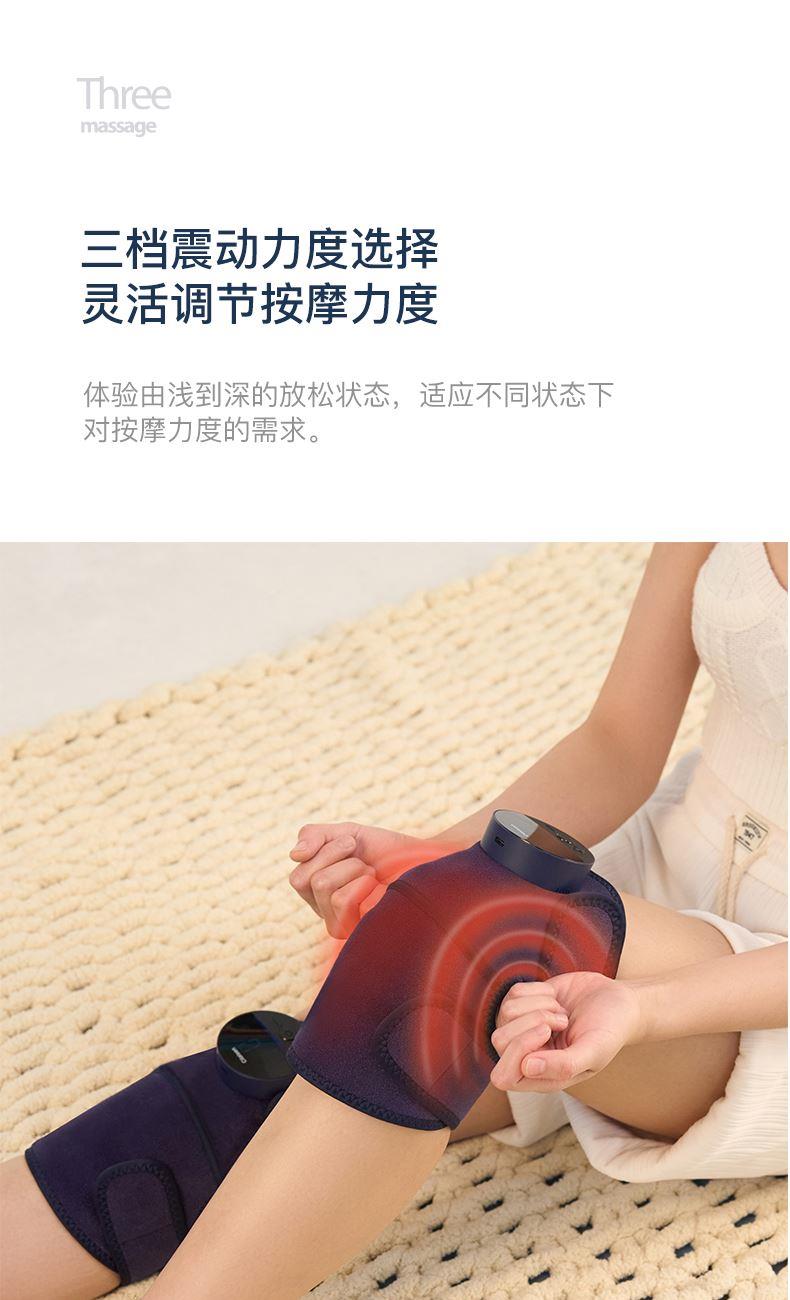 工作电压:3.7V 充电电压:5V 额定功率:7W 电池:2000mAh 产品尺寸:530*248*28(mm) 包装尺寸:315*174*70(mm) 产品毛重:0.6kg 包装清单:按摩仪X2、充电线x1、说明书x1 核心卖点: 1. 三档力度选择 ,灵活调节震动力度 2、紧贴膝部轮廓,稳固舒适不滑落 3、五档温控,科学调节,升级加大热敷面积 4、轻松承包膝/肩/肘按摩,15分钟智能定时