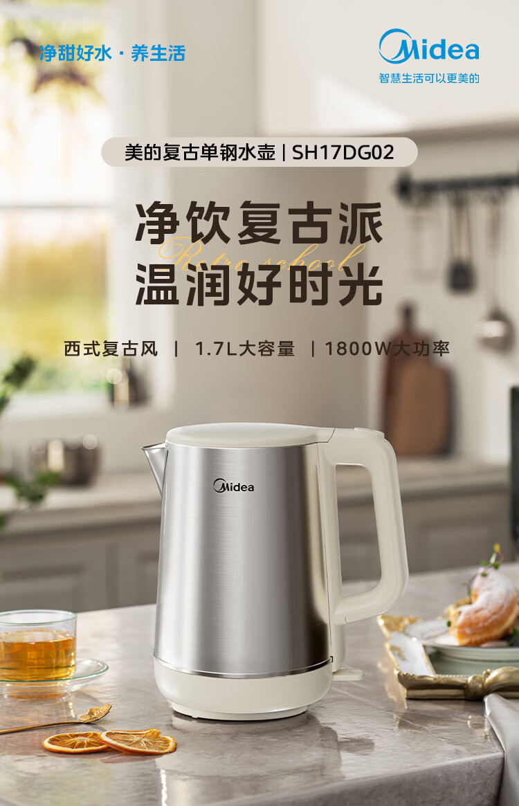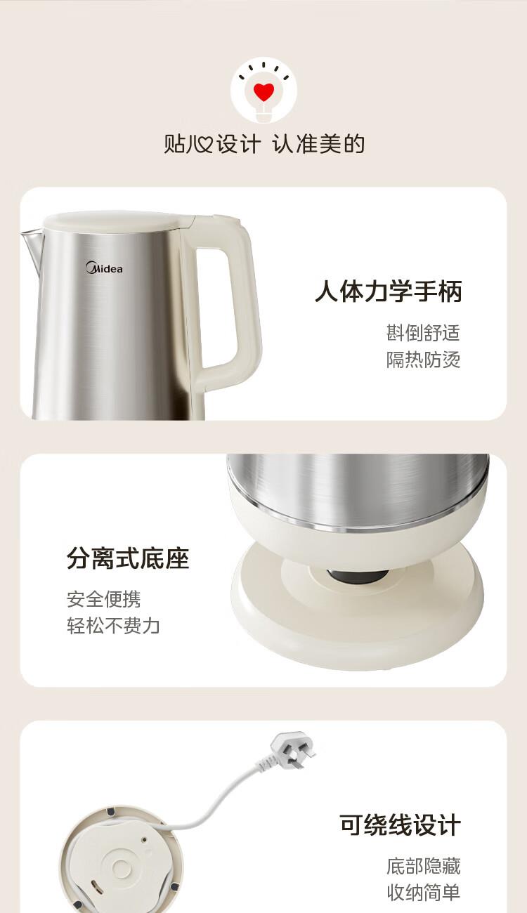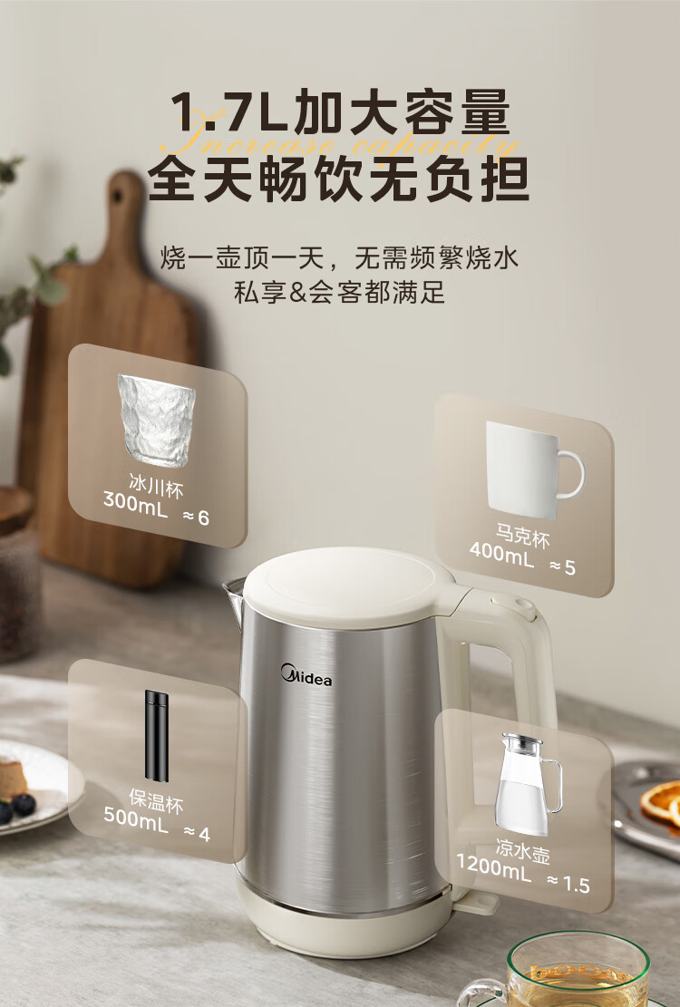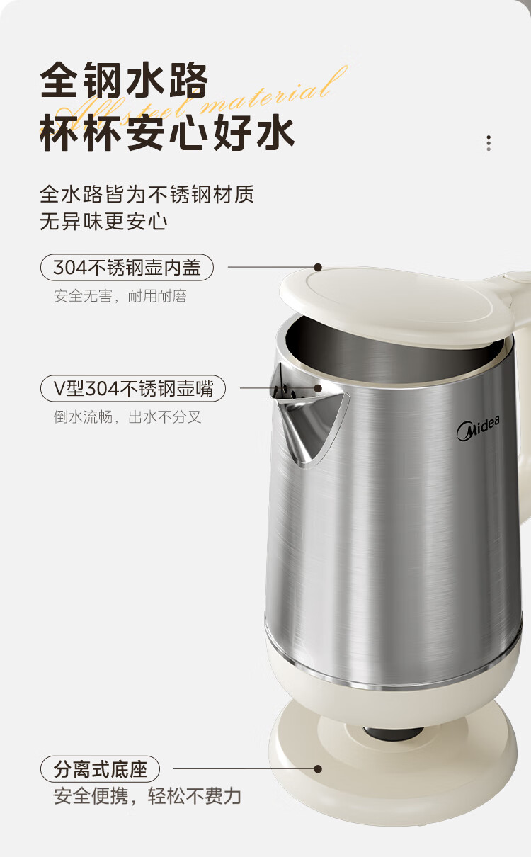 产品尺寸:225 x 210 x 270 mm 包装尺寸:222 x 152 x 221 mm 产品毛重:1.15kg 1.7L大容量 满足更多成员所需 1800W大功率 快速烧水不久等 全水路304食品级不锈钢材质