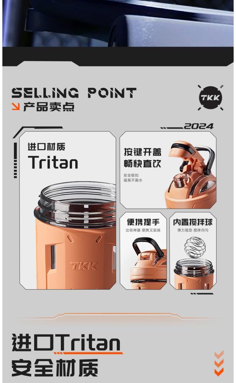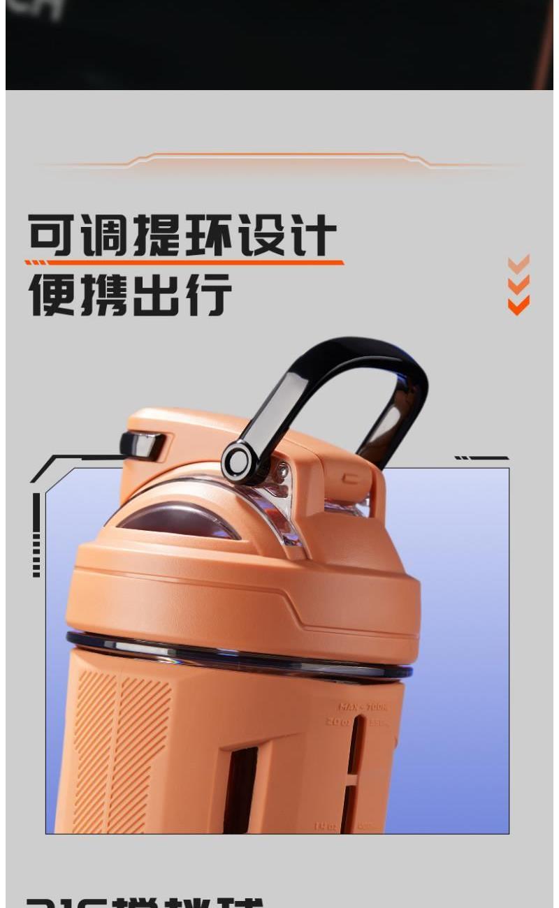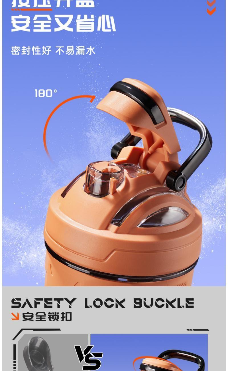 2.700ML;进口Tritan;食品级材质;超大容量;防漏设计;杯身"加厚冷热无惧变形;耐高温100度,耐低温:-20度。