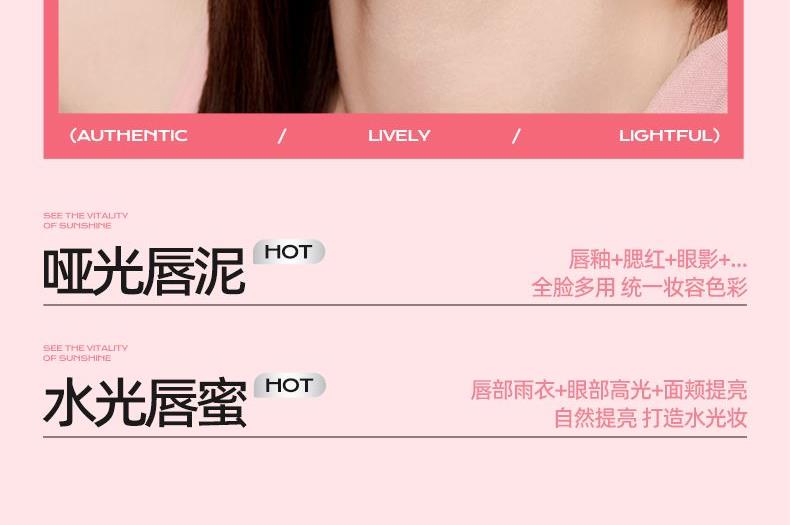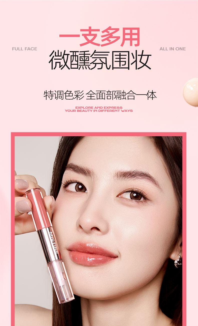 水光头:眼腮唇高光叠加,一键打造水光肌;料体薄亮贴唇贴肤,降低粘度。