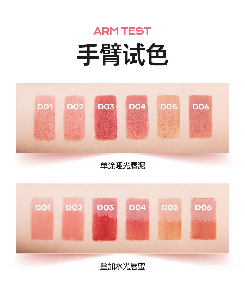 哑光头:偏唇泥质地,顺滑柔焦隐匿唇纹效果好,和底妆不打架能够作为腮红泥和眼影打造全脸妆容