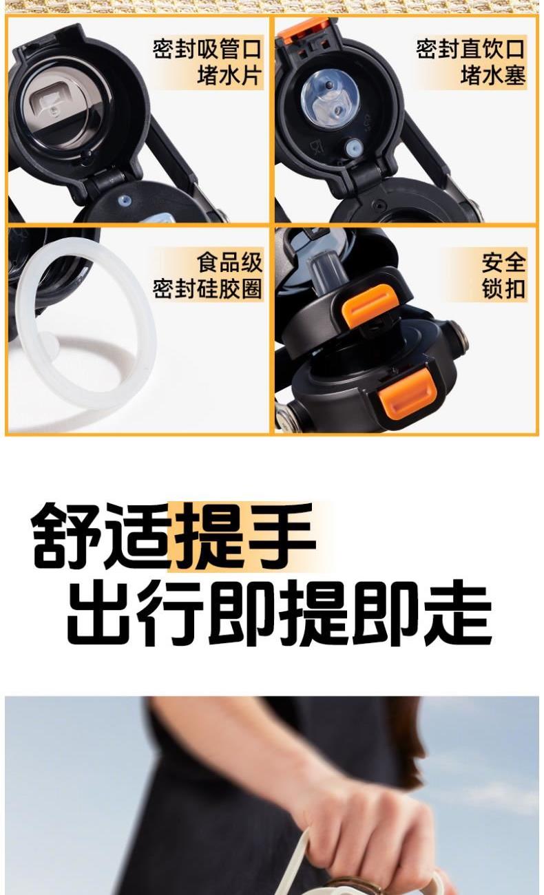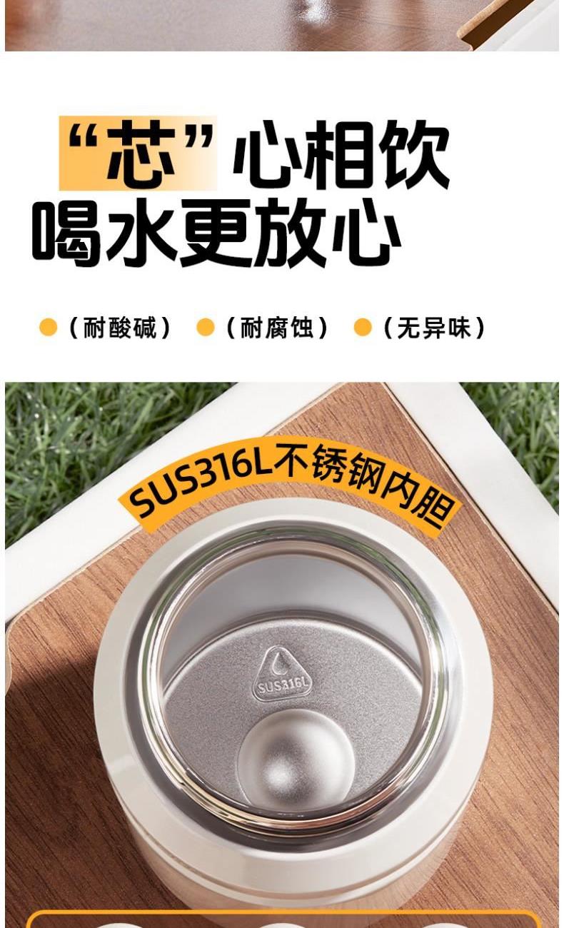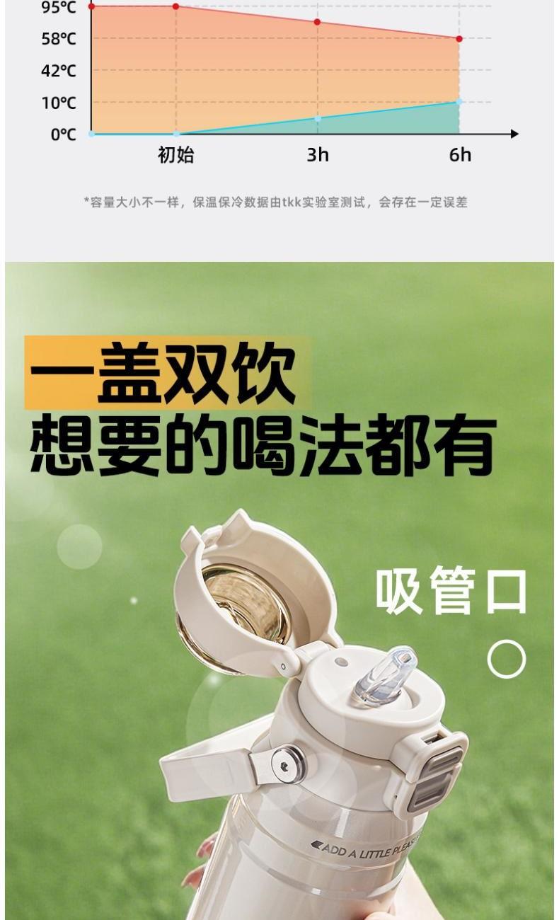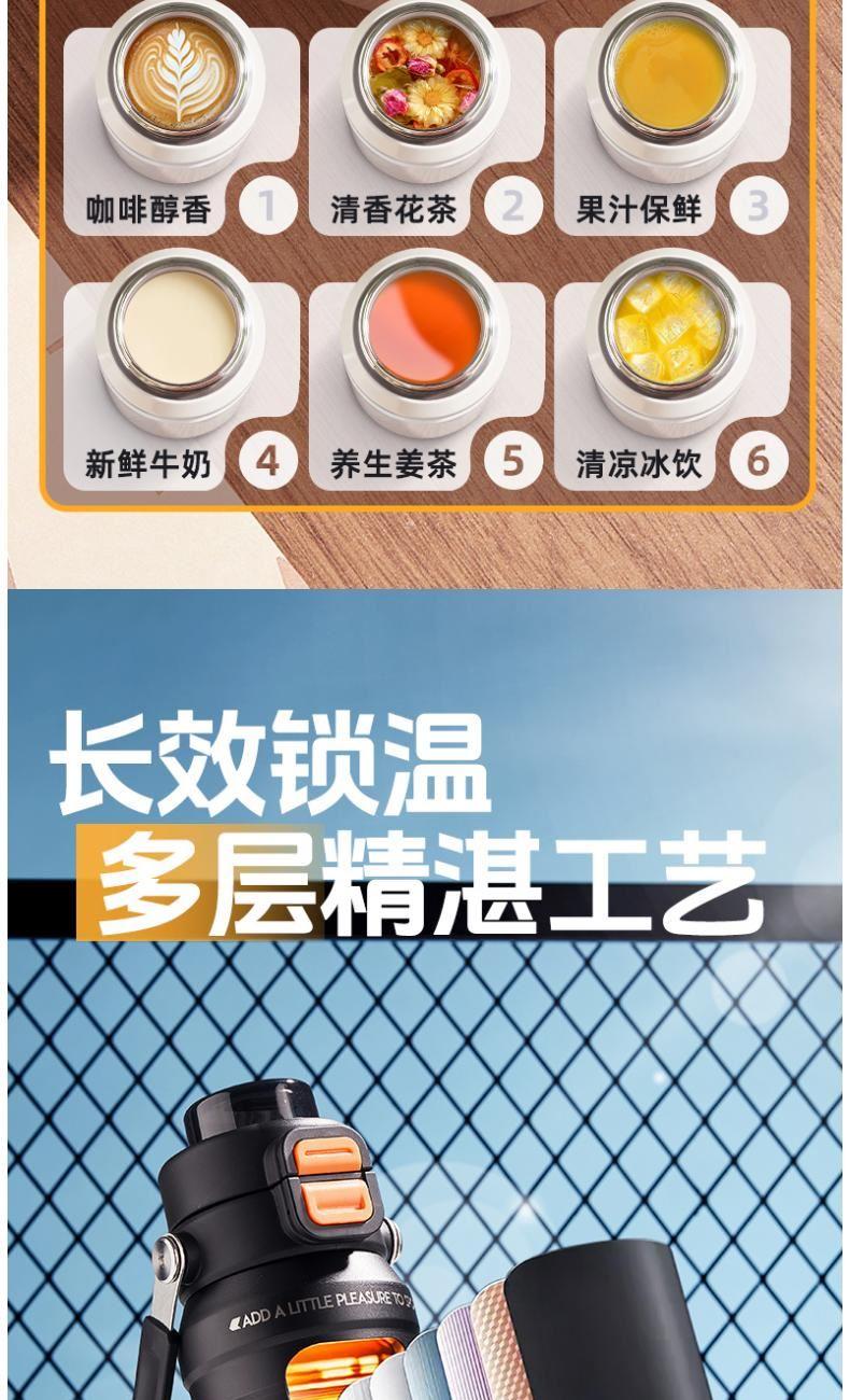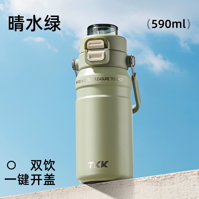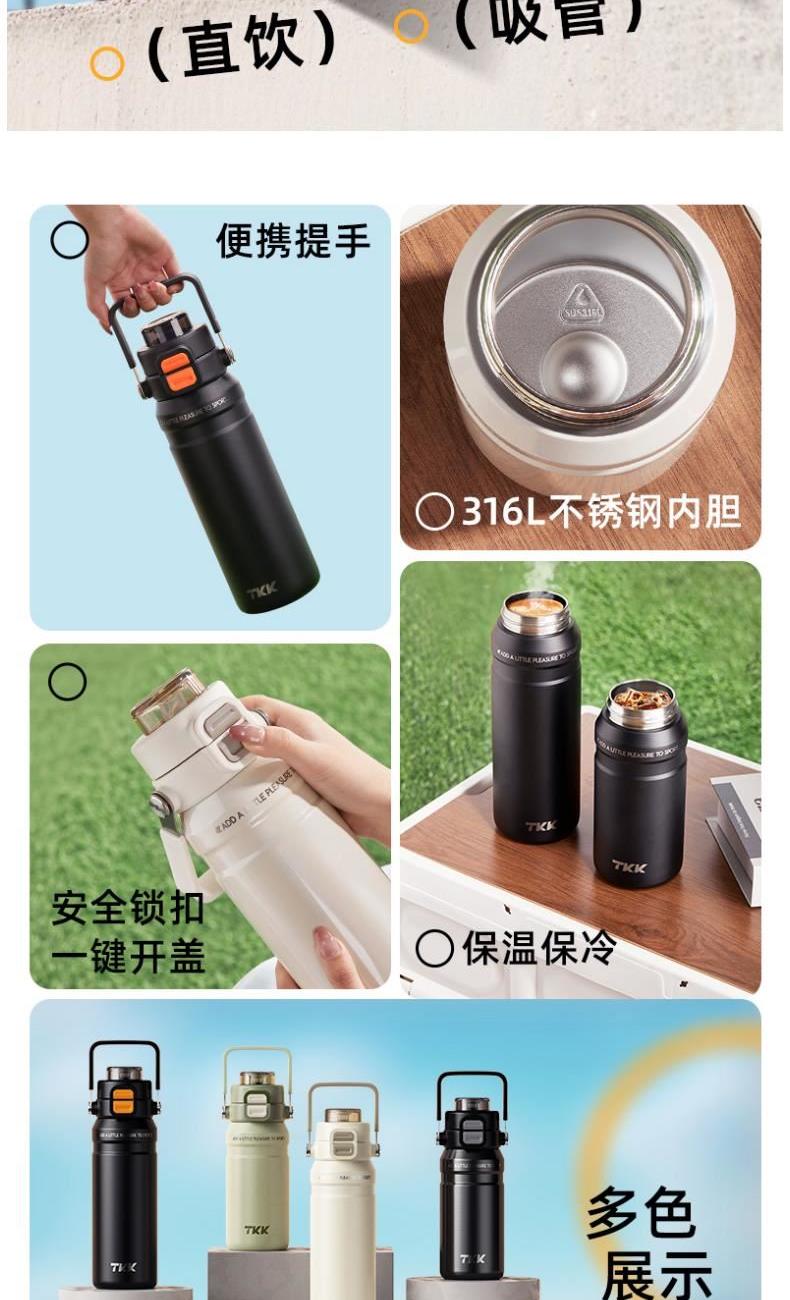 商品容量:590ml 杯身材质:316不锈钢 商品净重:401G 商品尺寸:8.7x9.3x23cm 1、甄选316不锈钢材质,长效保温保冷,抗酸碱耐腐蚀 2、多种防漏设计,精密密封圈,倒置不漏。 3、一杯双饮,单手开盖无压力,不易呛口,够喝一整天。 4、安全锁扣,按压上翻开盖,可固定翻盖。 5、简约时尚运动配色,耐看,耐脏易清洗。 6、硅胶杯底杯盖防滑垫,静音放置,放置稳固。