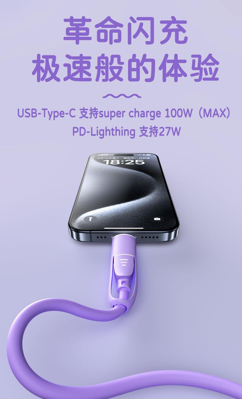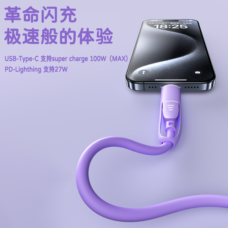 S6四合一66W超级快充硅胶数据线 颜色:绿色 紫色 黑色 粉色 白色 材质:编织线 尺寸:1M 包装:彩盒包装 【功能特点】: A/C口二拖二设计,兼容苹果15以上充电 66W超级快充,充电更快, C-C 66W / C-L27W 液态硅胶线,一体成型充电头 1米长度设计,使用方便 亲肤手感,丝滑柔顺不打结