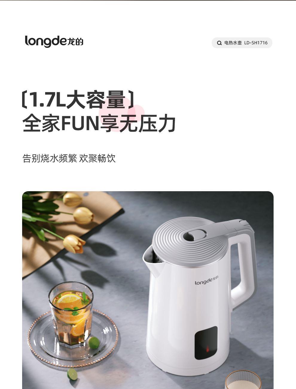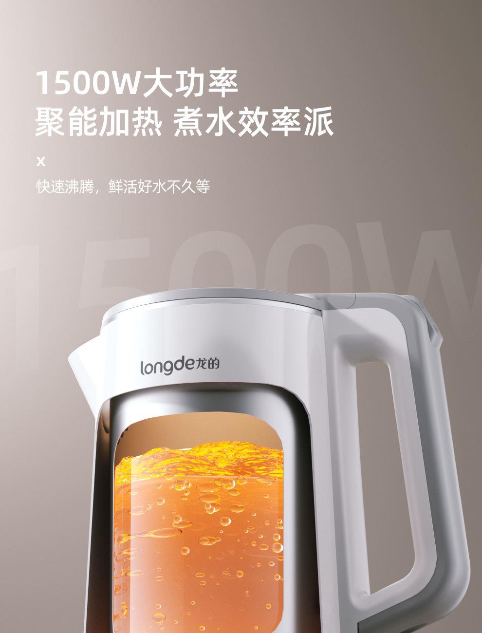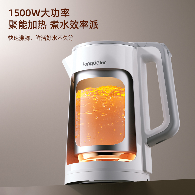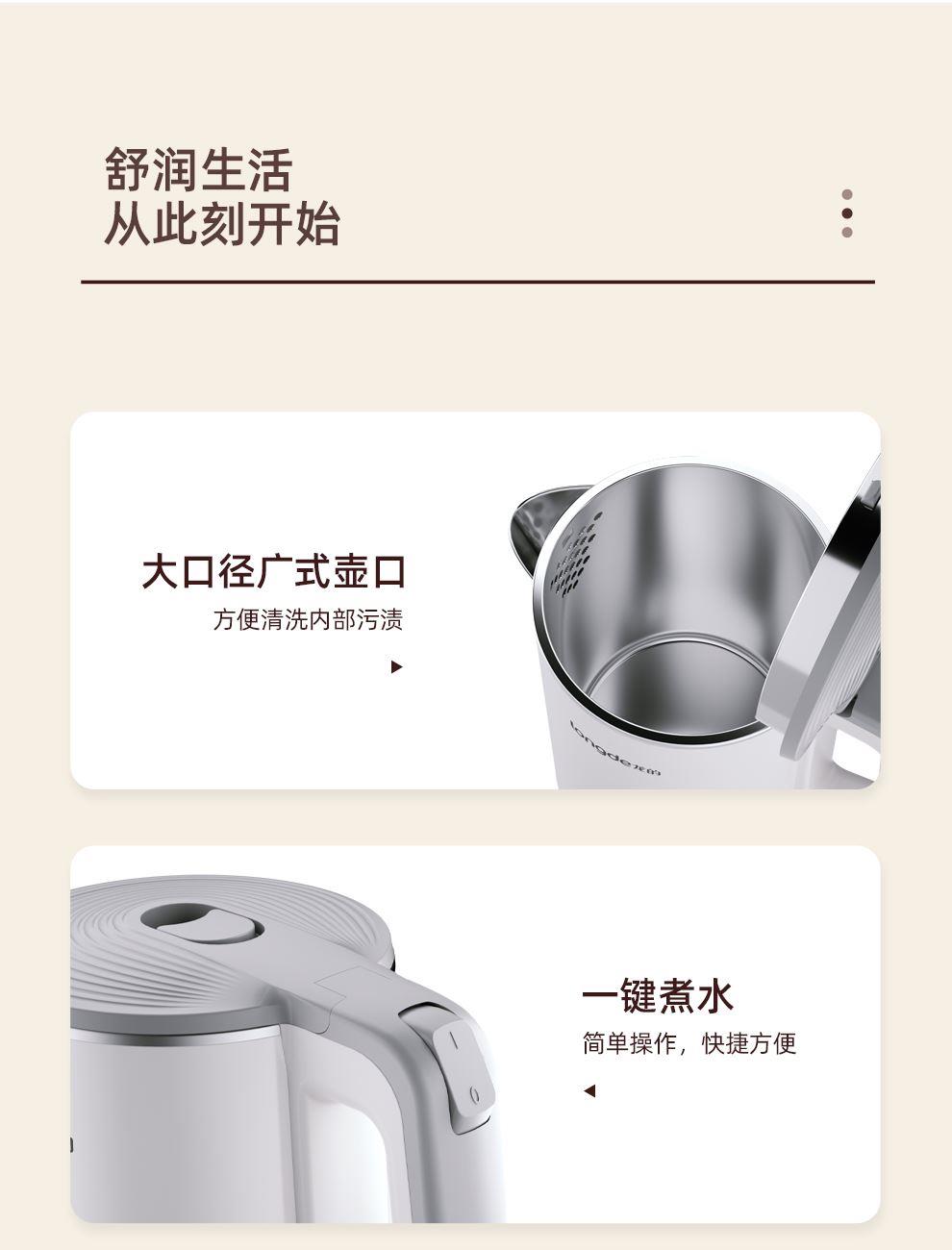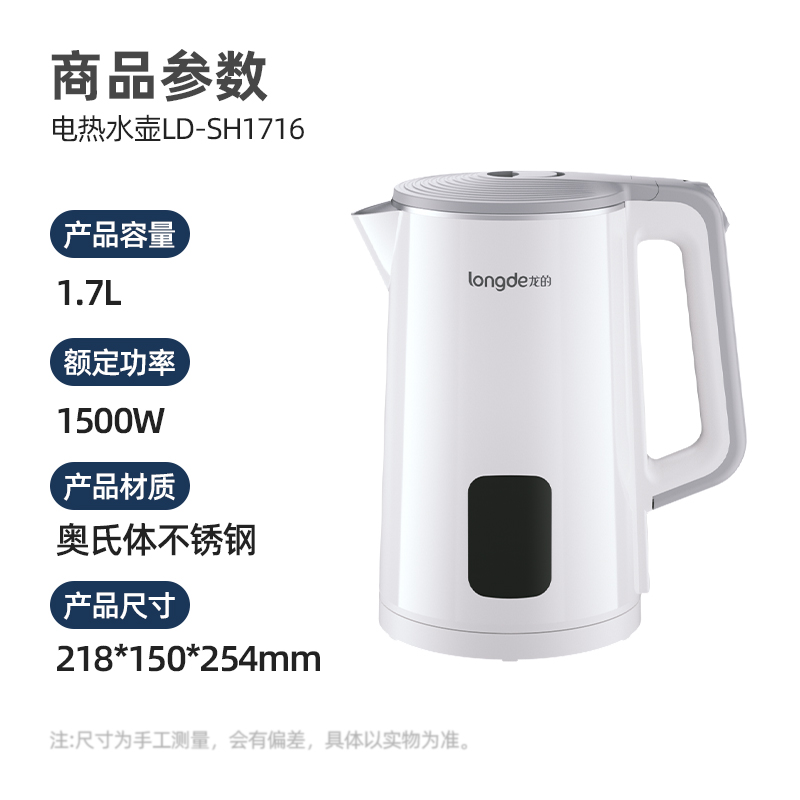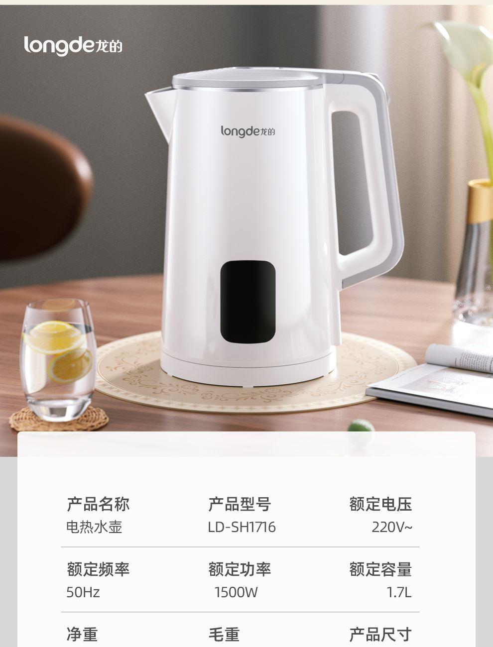 额定功率:1500W 产品容量:1.7L 额定电压:220V~ 产品频率:50Hz 产品净重:0.9kg 产品毛重:1.1kg 整箱重量:18.5kg 双层防烫,食品级不锈钢内胆 拉式开盖,不甩水安全方便 大口径出水烧水、出水顺畅不滴漏 双金温控优质温控器,干烧保护