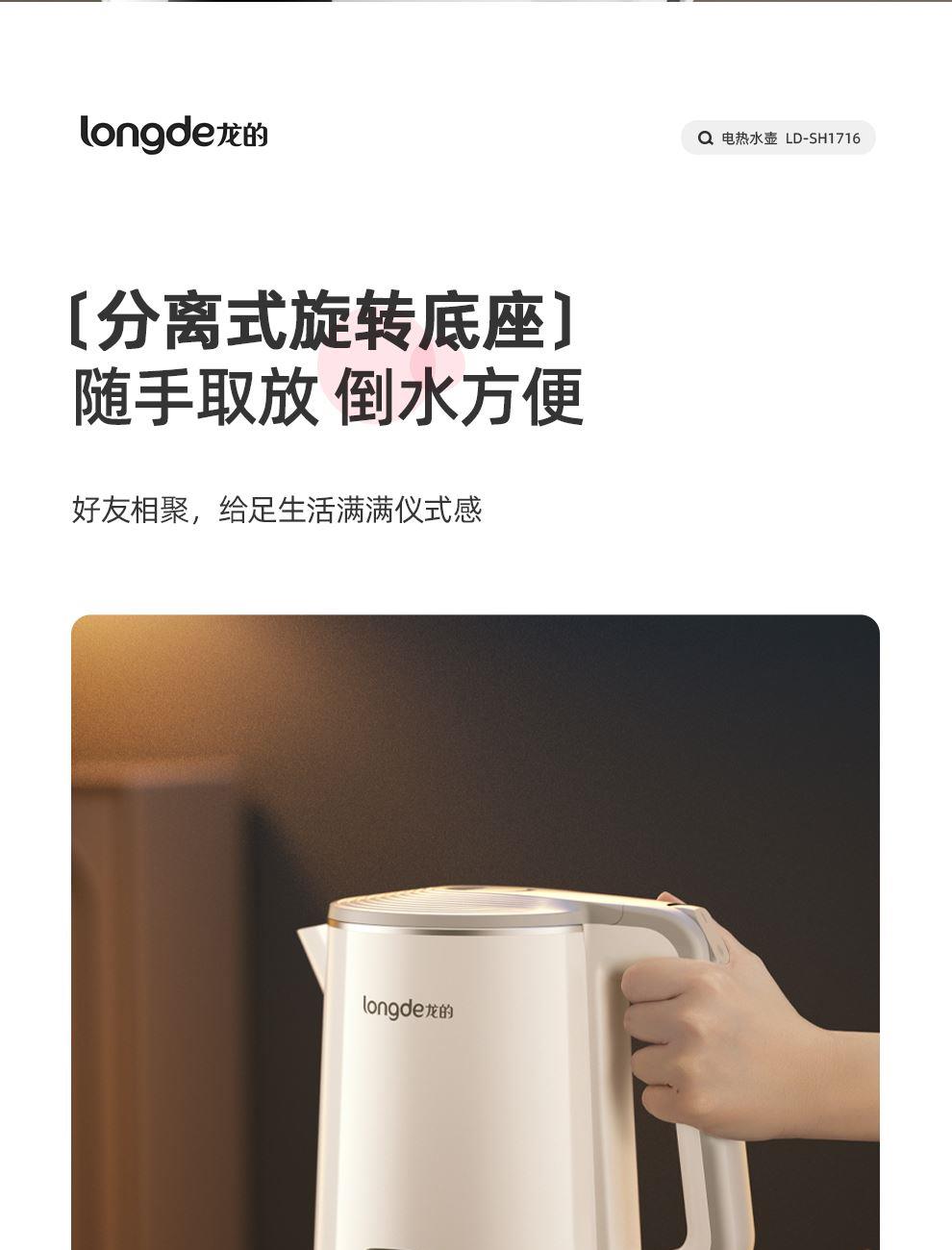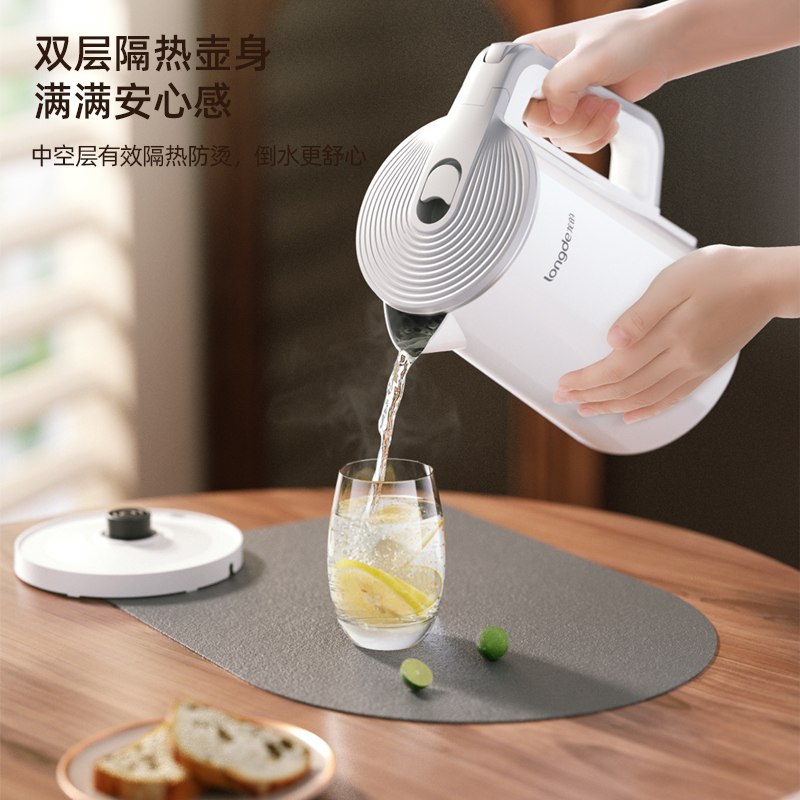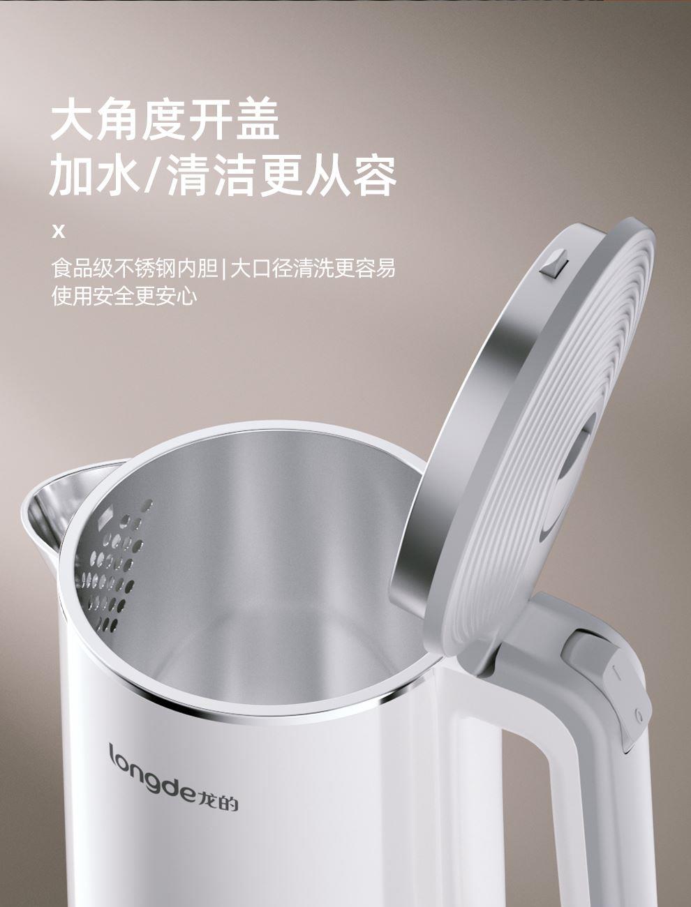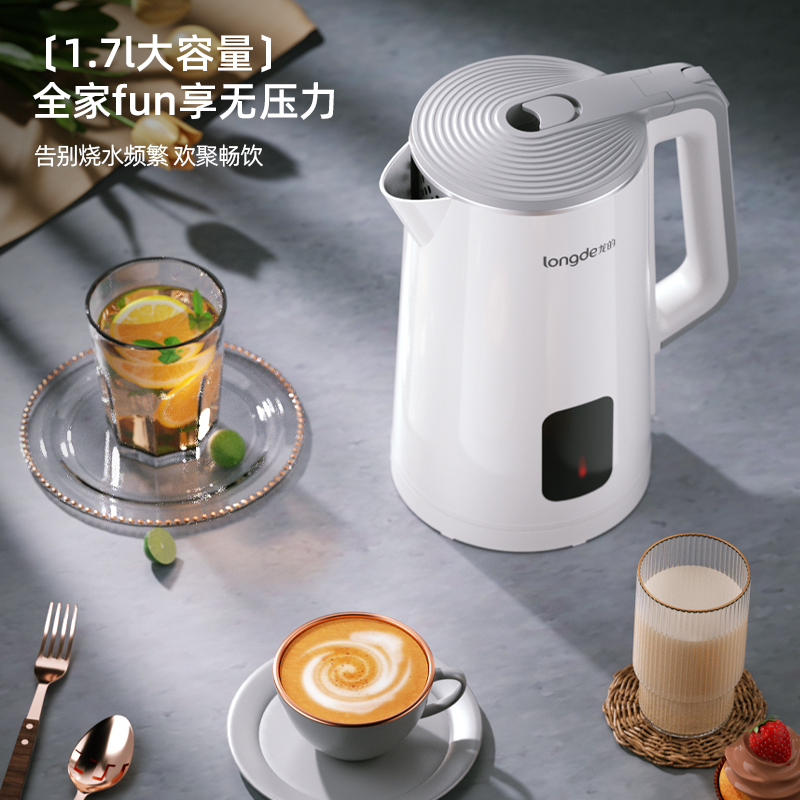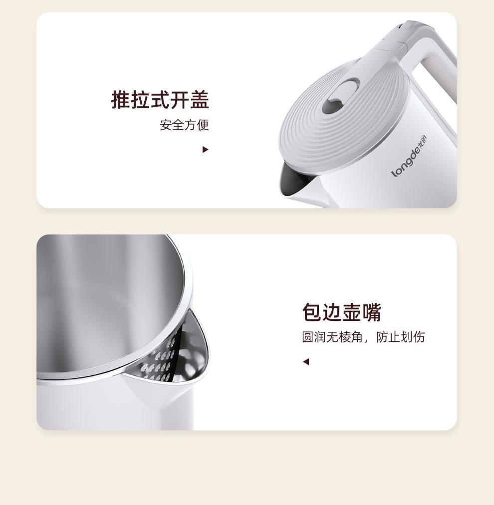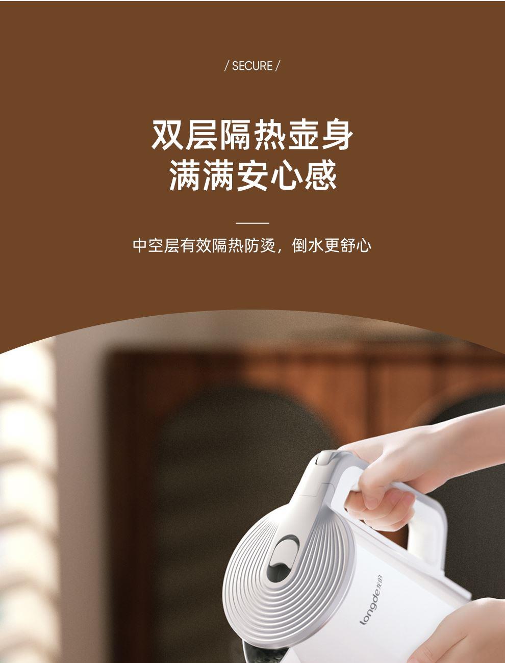 额定功率:1500W 产品容量:1.7L 额定电压:220V~ 产品频率:50Hz 产品净重:0.9kg 产品毛重:1.1kg 整箱重量:18.5kg 双层防烫,食品级不锈钢内胆 拉式开盖,不甩水安全方便 大口径出水烧水、出水顺畅不滴漏 双金温控优质温控器,干烧保护