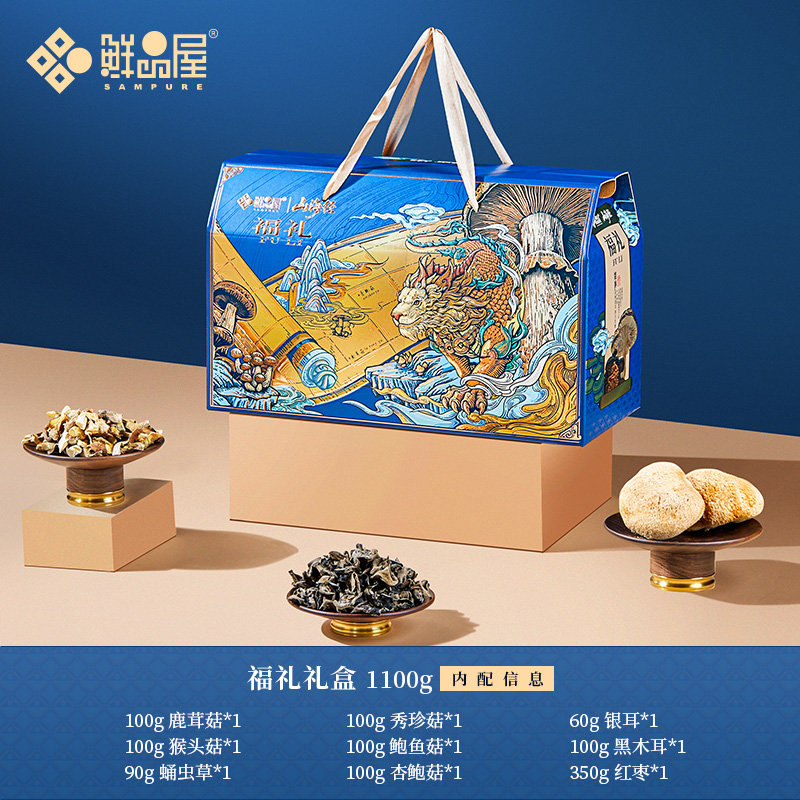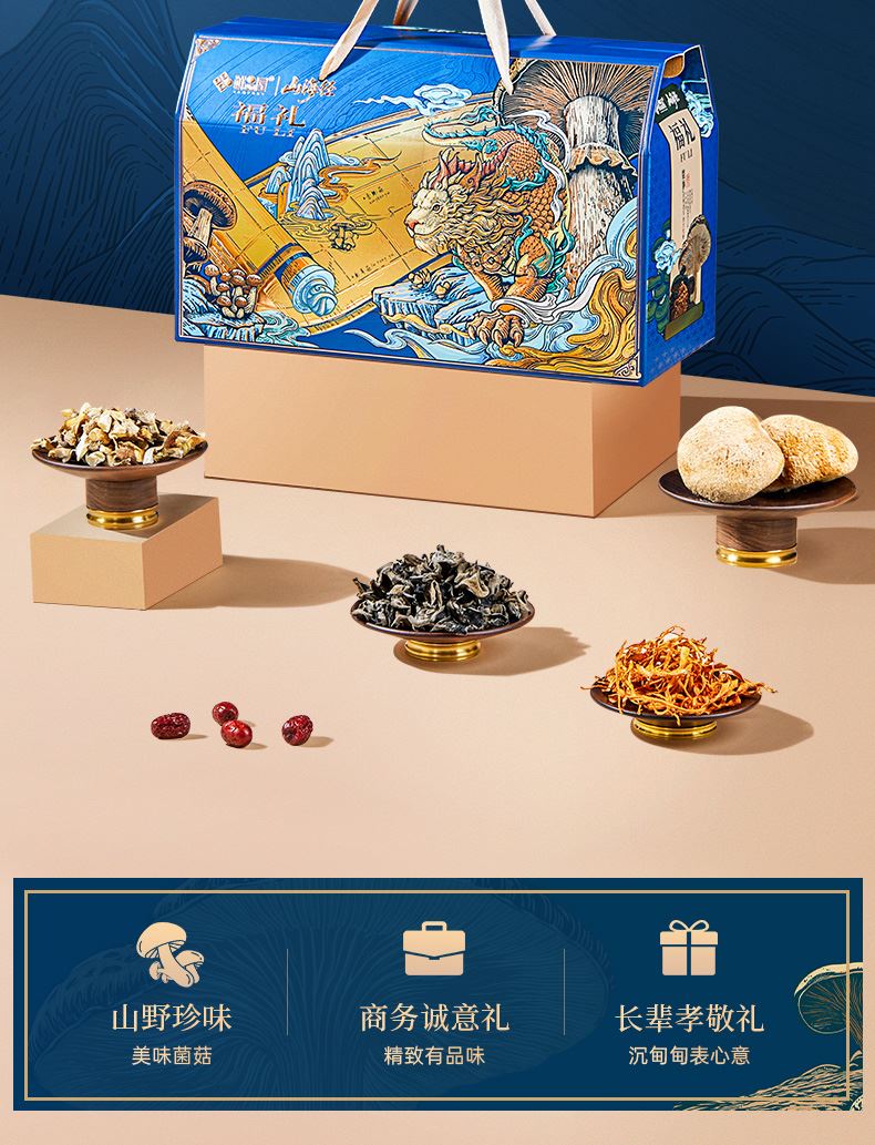 100g鹿茸菇*1 100g猴头菇*1 90g蛹虫草*1 100g秀珍菇*1 100g鲍鱼菇*1 100g杏鲍菇*1 100g黑木耳*1 60g银耳*1 350g红枣*1