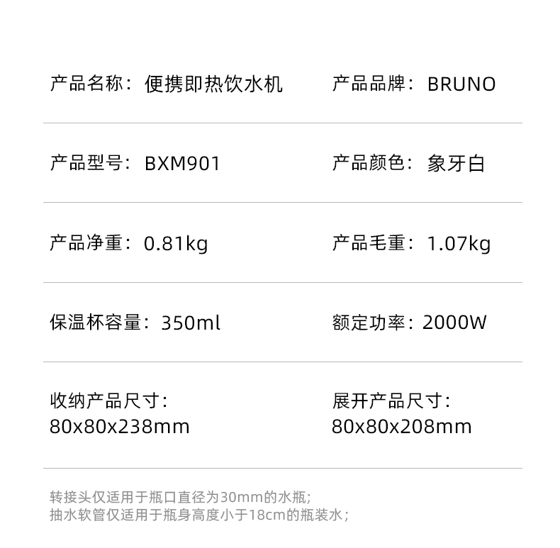 产品型号:BXM901 产品颜色:白色 产品容量:随行水杯:300ML 功率:2000W 产品净重:约0.85KG 额定电源:220V 产品尺寸:约82*82*238mm 功能:自清洁/排空,温度(常温、45℃、60℃、75℃、95℃),出 水/咖啡,杯量(150ml/250ml/350ml),童锁