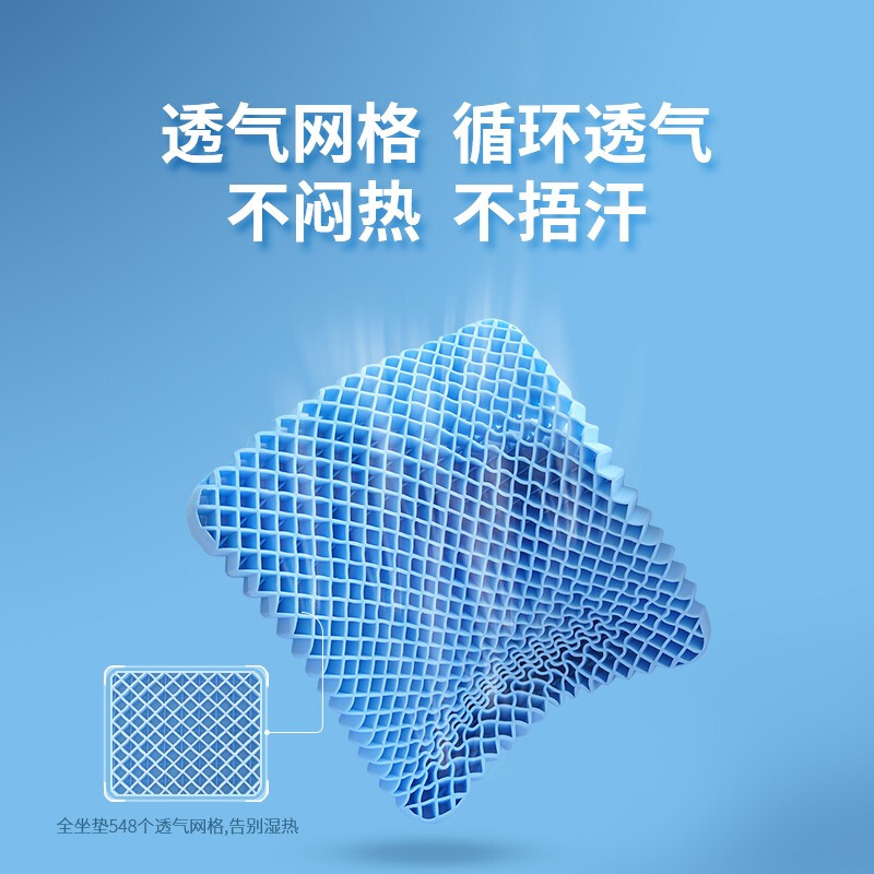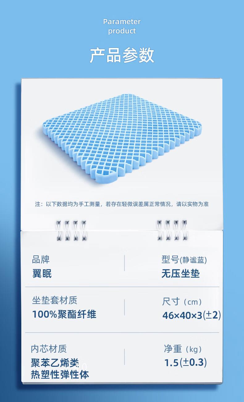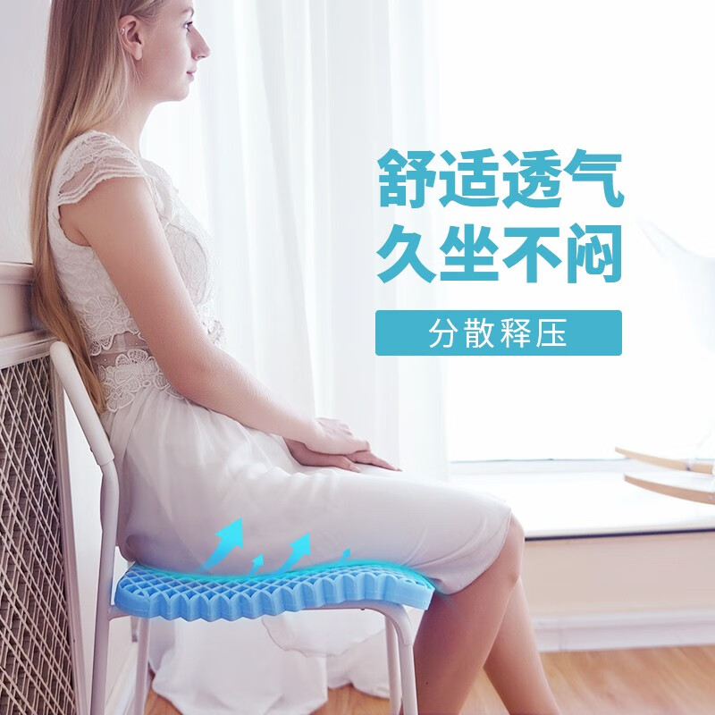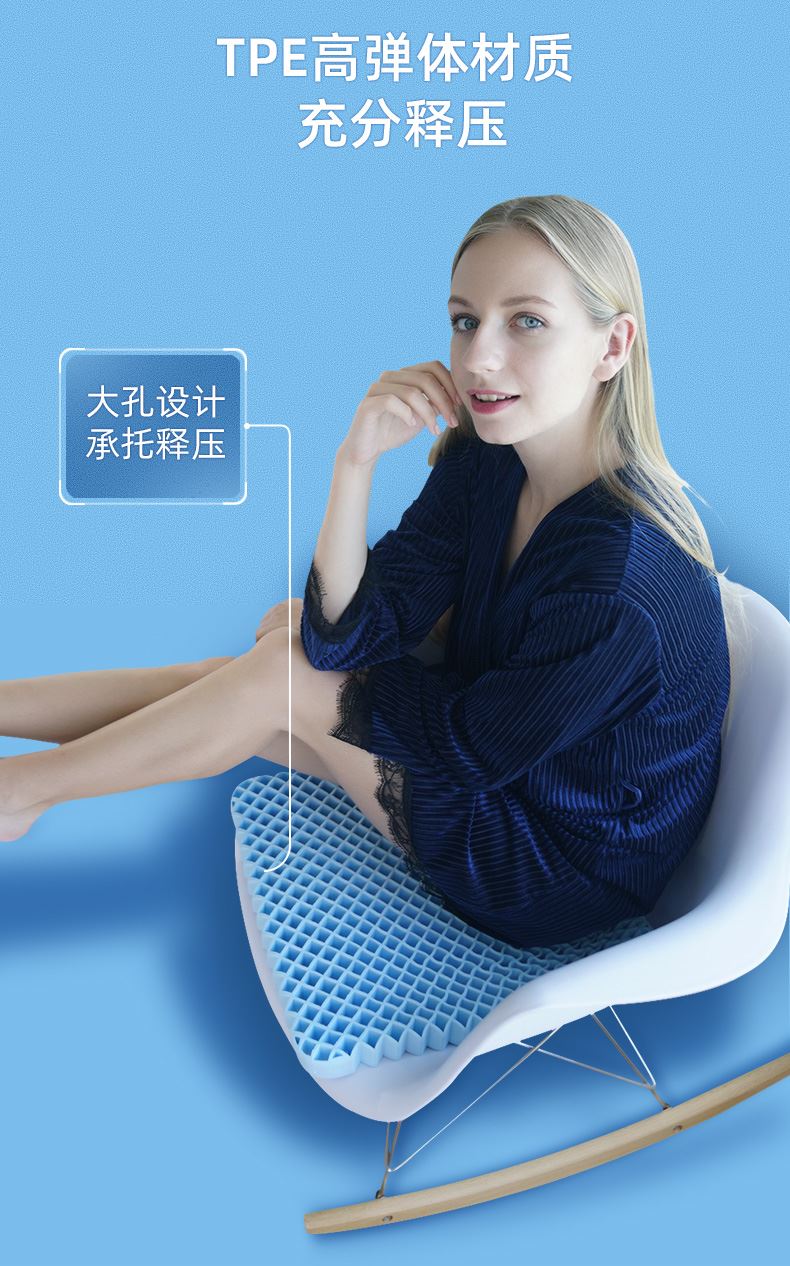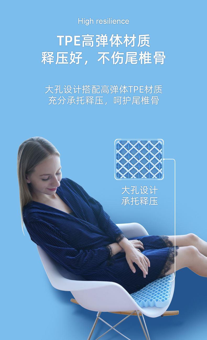 产品尺寸:46*40*3.2cm 重量约:1.6kg 颜色:淡蓝色,黑色外套 适用人群:成人 座垫软硬度可调,尺寸大小可设计定制, 高弹复合材料TPE,亲肤,造型符合人体工学, 可水洗,持久使用,透气,不变形, 安全环保无毒