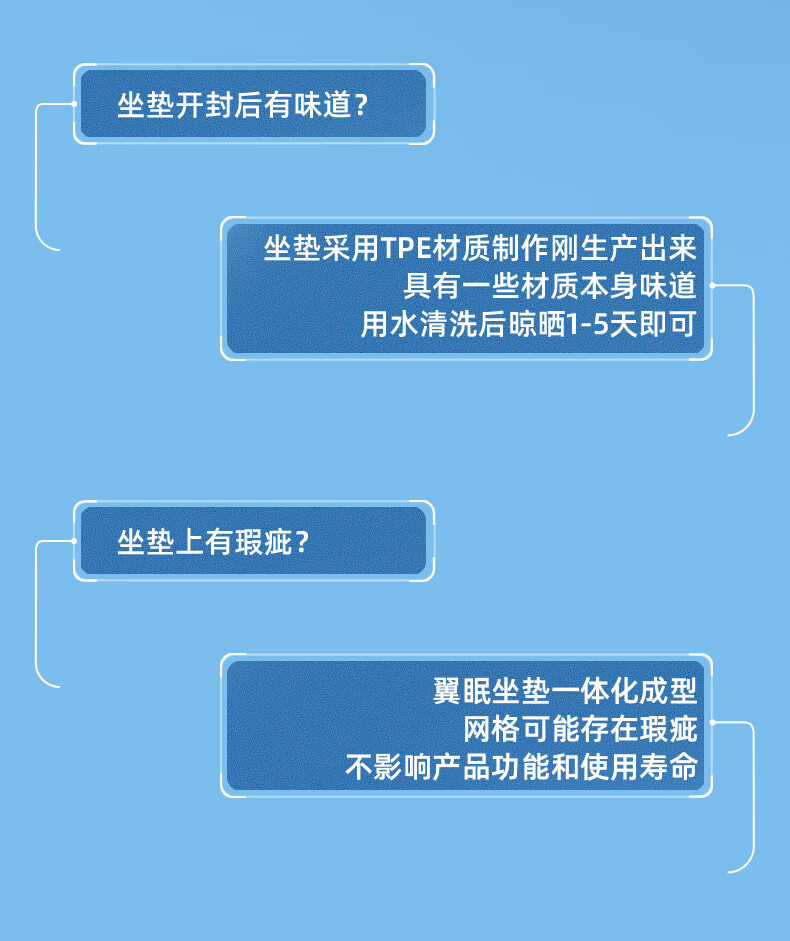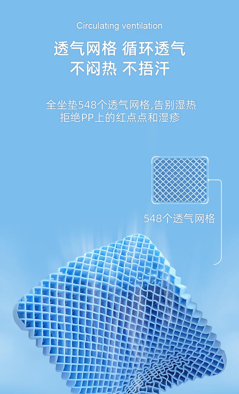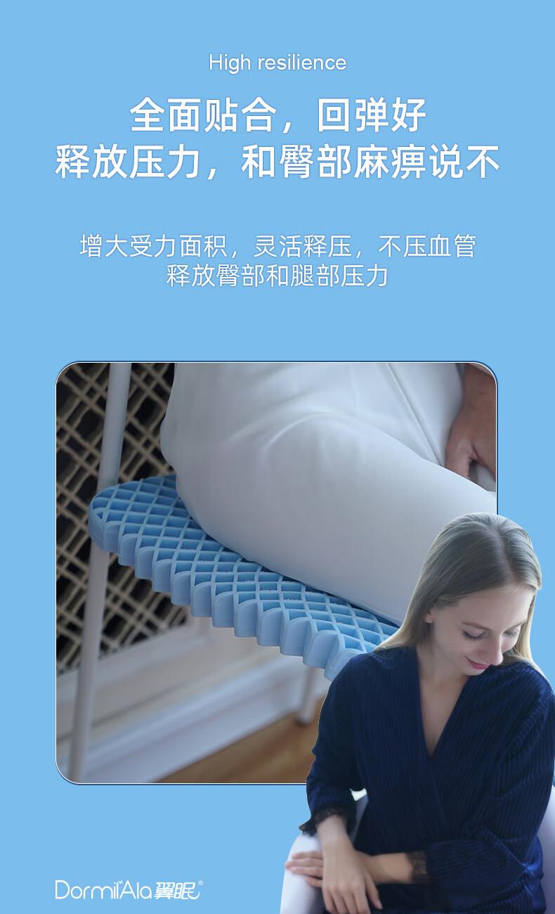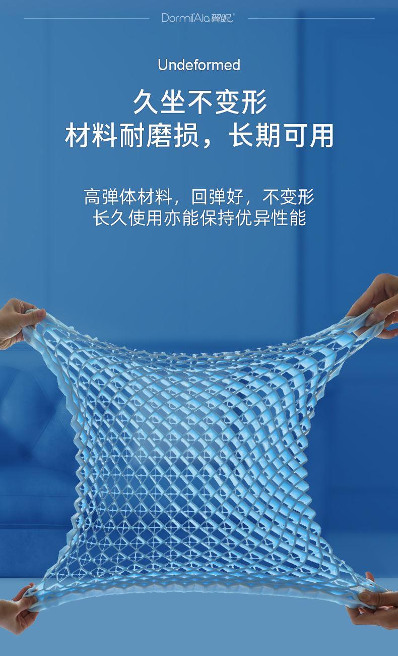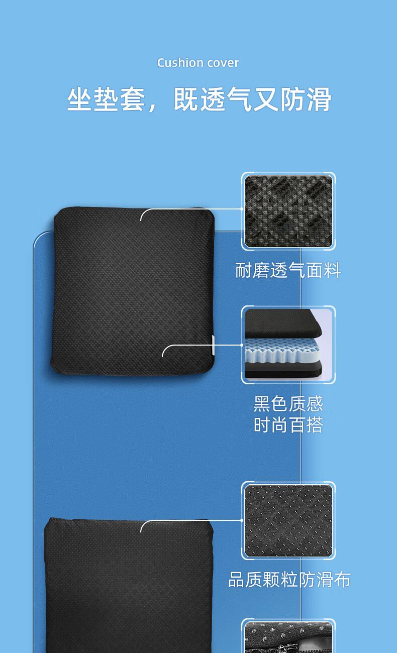 产品尺寸:46*40*3.2cm 重量约:1.6kg 颜色:淡蓝色,黑色外套 适用人群:成人 座垫软硬度可调,尺寸大小可设计定制, 高弹复合材料TPE,亲肤,造型符合人体工学, 可水洗,持久使用,透气,不变形, 安全环保无毒