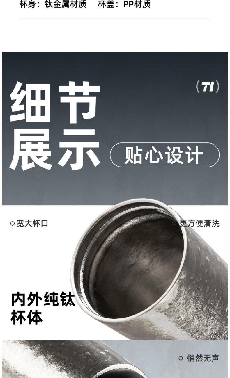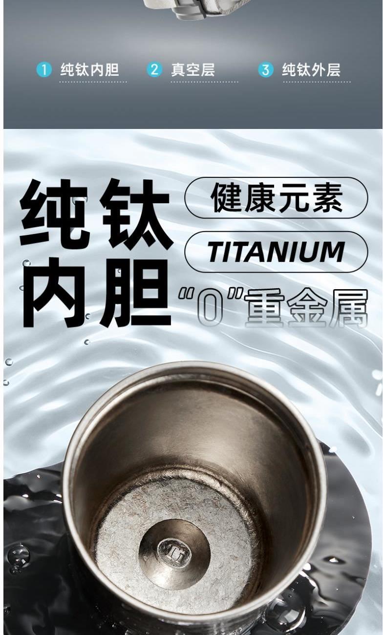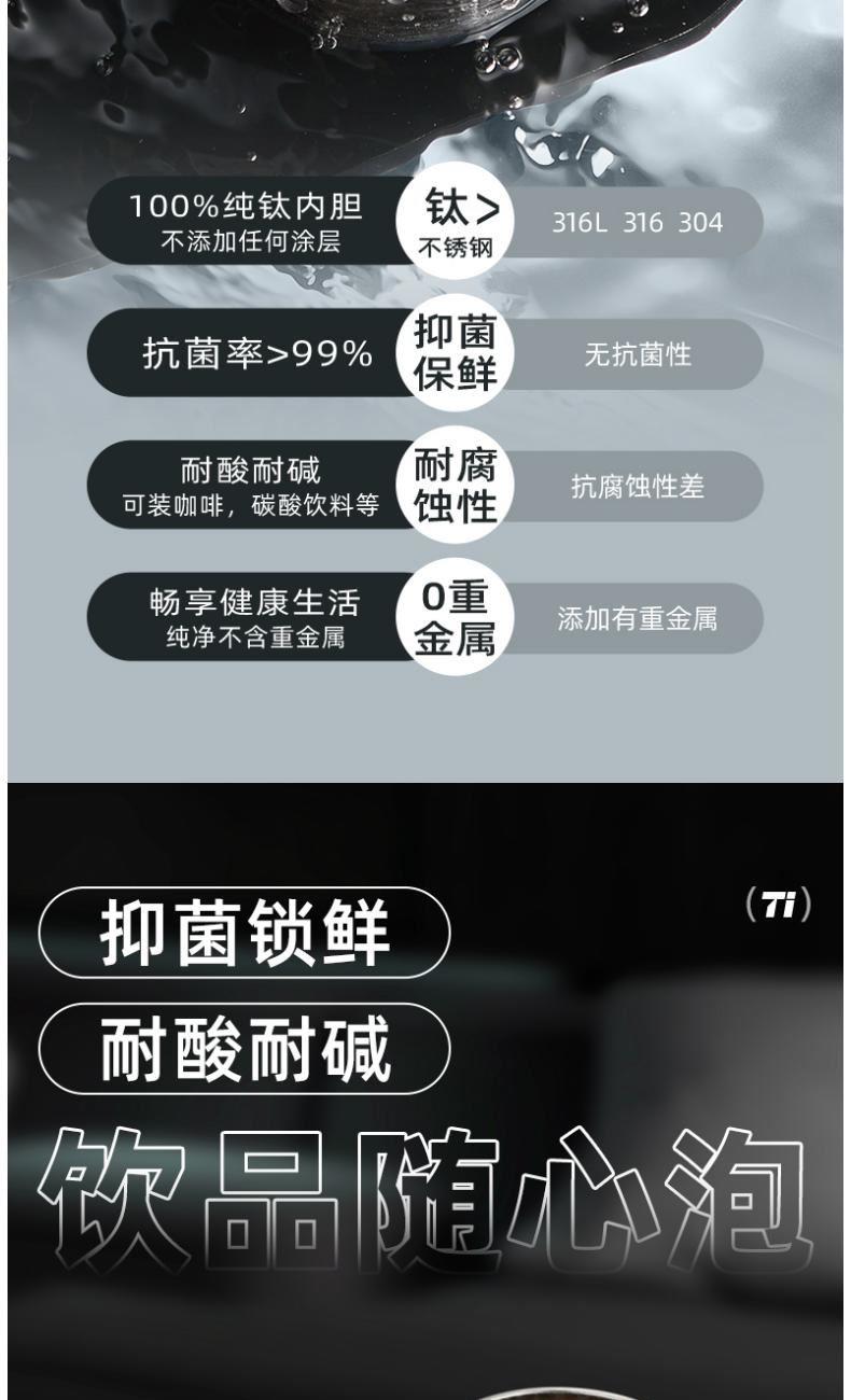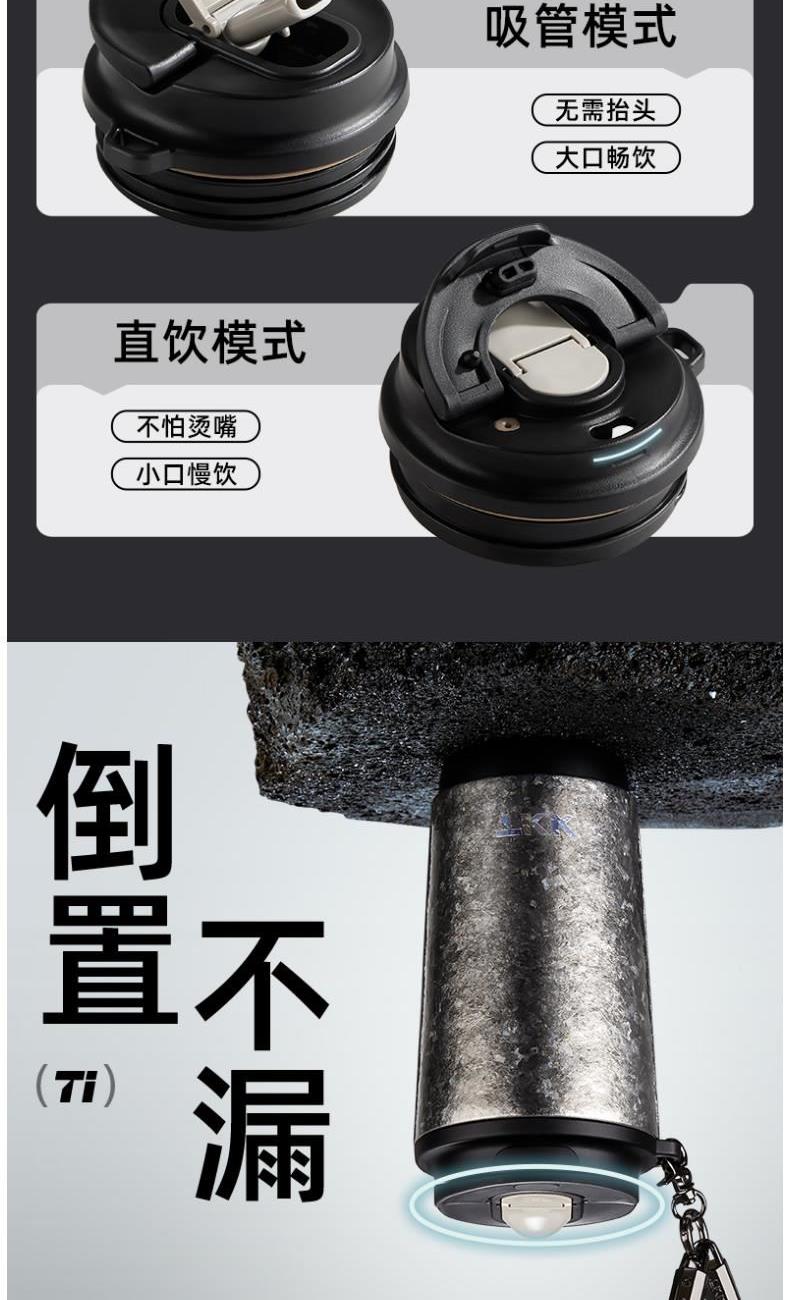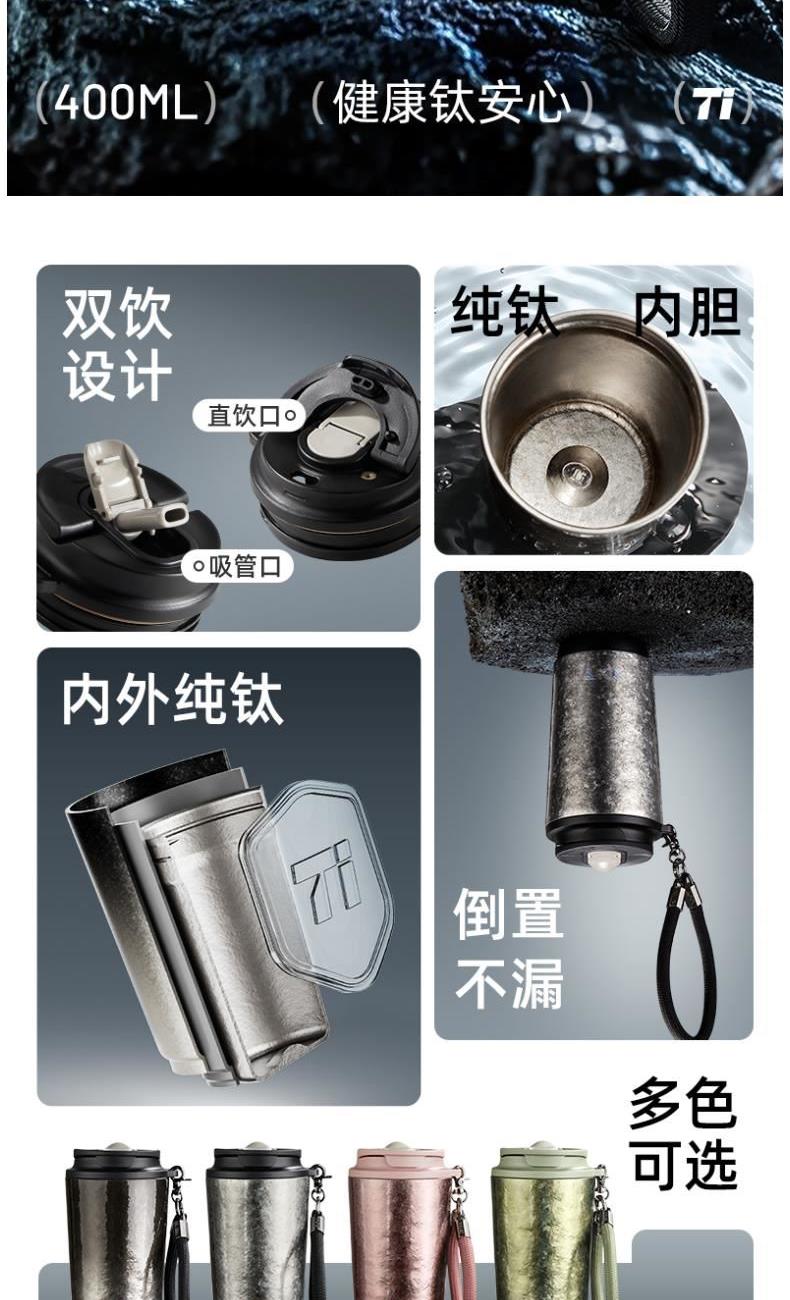 商品容量:400ml 杯身材质:钛 商品净重:270G 商品尺寸:8.5 X 16.4cm 1、内胆采用黑科技钛,无异味,耐高温,耐腐蚀;健康无味,喝水更放心,保温又保冷锁定咖饮温度 2、一盖双饮,一杯双用,三种饮用模式:直饮,吸管,敞口随意切换 3、360度密封不易漏,紧锁每一滴水,无惧翻转摇晃,安心随行 4、办公场景,活力满满忙碌又充实 5、便携车载,旅程陪伴,单手开盖更加便捷,小口饮用不易洒 5、品质做工精细,专注更好的饮水体验:如密封硅胶圈,双重密封不怕漏