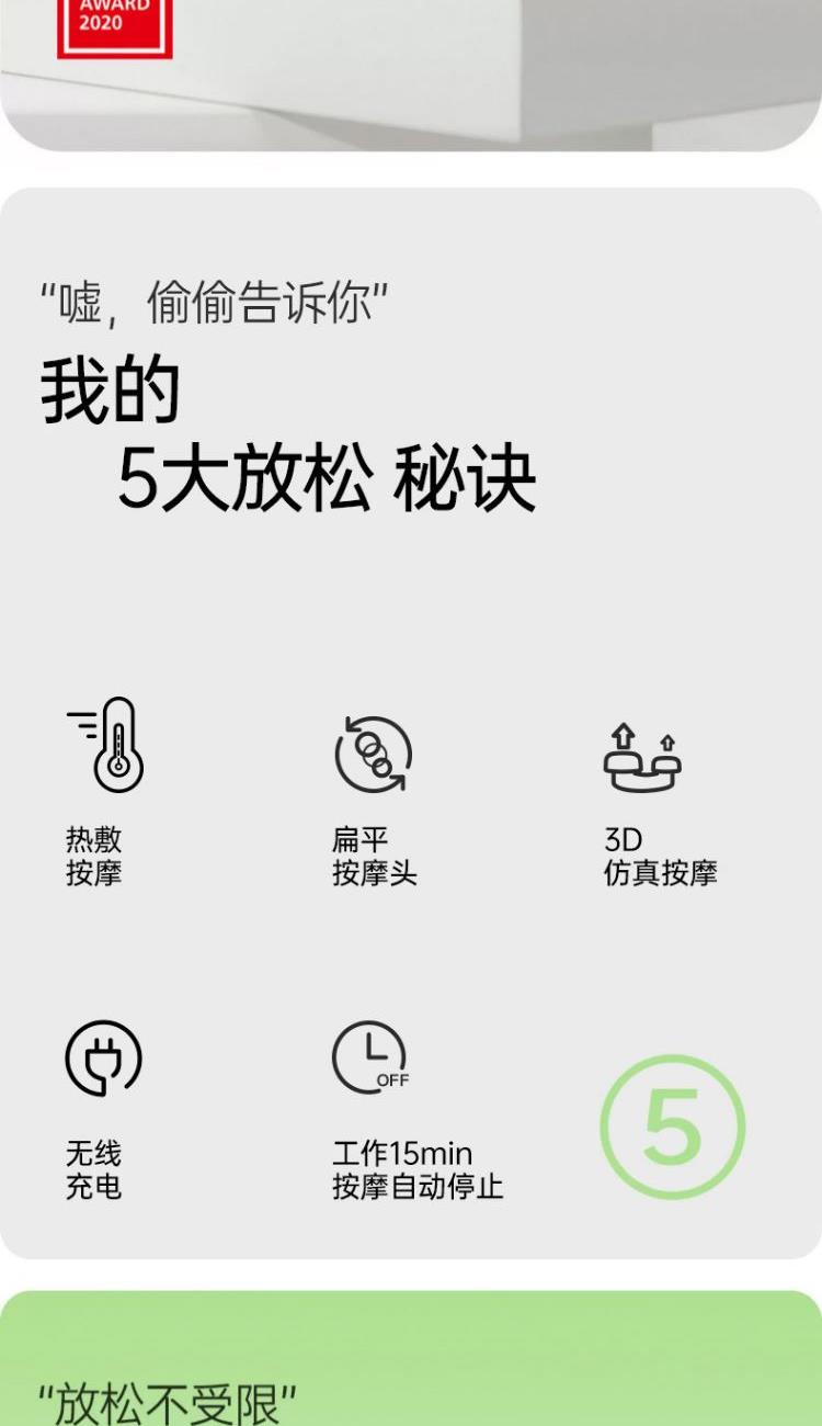 产品型号:LF-YK006-SGY 产品颜色:古典灰 产品尺寸:310*210*127mm 电池容量:2600mAh 产品净重:1.45±0.2KG 充电线长:1.5m 立体按摩头:4颗 按摩深度:40mm 按摩面积:25.4mm 电池规格:7.4V 2600MAH(2节18650电池) 充电时间:约3-4H(电池放电完后使用电源适配器充满电时间)