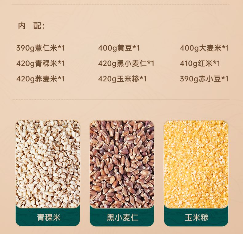 390g薏仁米*1 420g青稞米*1 420g荞麦米*1 400g黄豆*1 420g黑小麦仁*1 420g玉米糁*1 400g大麦米*1 410g红米*1 390g赤小豆*1