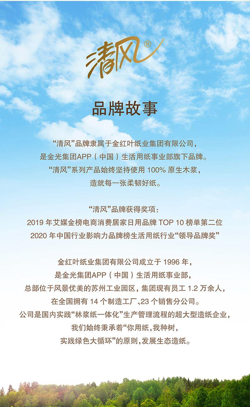 香型:无香 主要原料:原生木浆 保质期:3年 细腻好纸,7年相思木,1张细腻纸。 1.原生木浆 使用原生种植林原木生产的木浆,从源头保证绿色健康品项。全程严控更放心,不添加可迁移性荧光增白剂。 2.四层厚实,蓬松舒软 原生木浆好木出好纸,纸感细腻,棉柔亲肤。 3.湿水依旧强韧 湿水不易破,吸水力UP,多场景安心使用。 4.纤维交织紧密 长短纤维交织工艺,黄金配比,成就柔韧细腻,不掉屑、不分层,自然亲肤,品质呵护。 清风 隶属于金光集团APP,实力拥有“林浆纸一体”产业链,“种6棵,用1棵”,在国内自有林场地面积超过27万公顷,碳储量4239万吨。