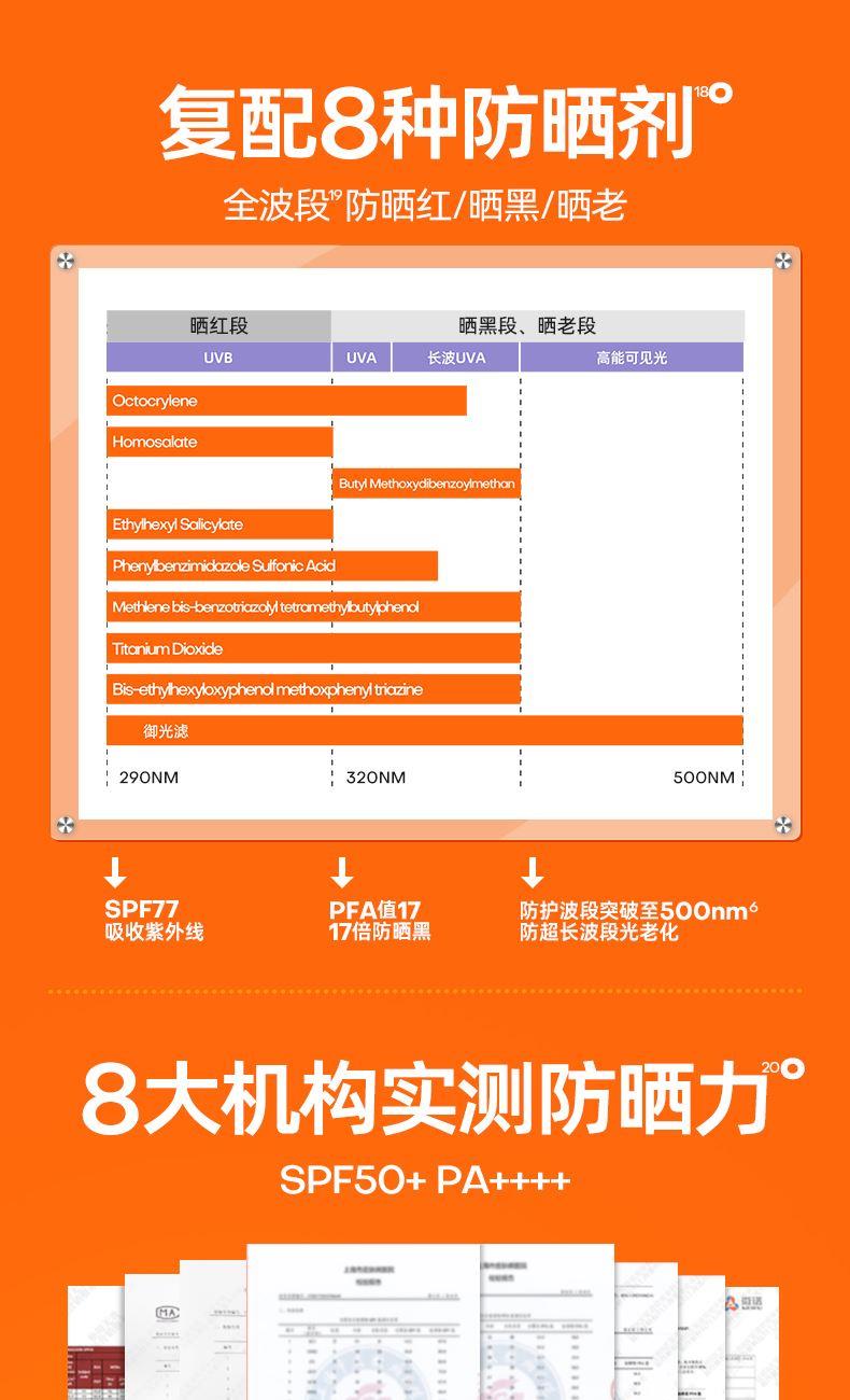 1.【科技升级】: 高倍防晒力 全波段防晒黑、防晒伤,上海皮肤病医院权威检测认证-SPF50+ PA++++ 高倍防晒,七大检测机构实测 2.【肤感升级】 专研AIR零感膜技术,一抹速成膜,空气般轻盈无感。SPF50+肤感专研Air 零感膜技术,MISTINE独有半乳化&水油双相防晒技术润而不油 不厚重 肌肤自由呼吸告别油包水剂型的“闷”感一抹,如轻风拂面 3.【科技升级】: 新增抗氧抑黑VC肽、强抗氧,抑制紫外线、蓝光诱发的自由基,减少胶原流失,帮助抵御晒老、晒纹;天然黄芩苷提取物,吸收紫外线,清除氧自由基,修护紫外线损伤;核心成分Taremi升级Taremi plus,280-400nm升级到280-450nm,帮助高效抗氧、提升防晒力、帮助抵御晒黑晒老。 4. 【友好升级】: 升级海洋友好配方,防晒配方不会造成珊瑚白化。 0酒精配方,10大不添加,安心配方、敏肌适用:不含尼泊金酯类防腐剂,不闷痘不致痘。