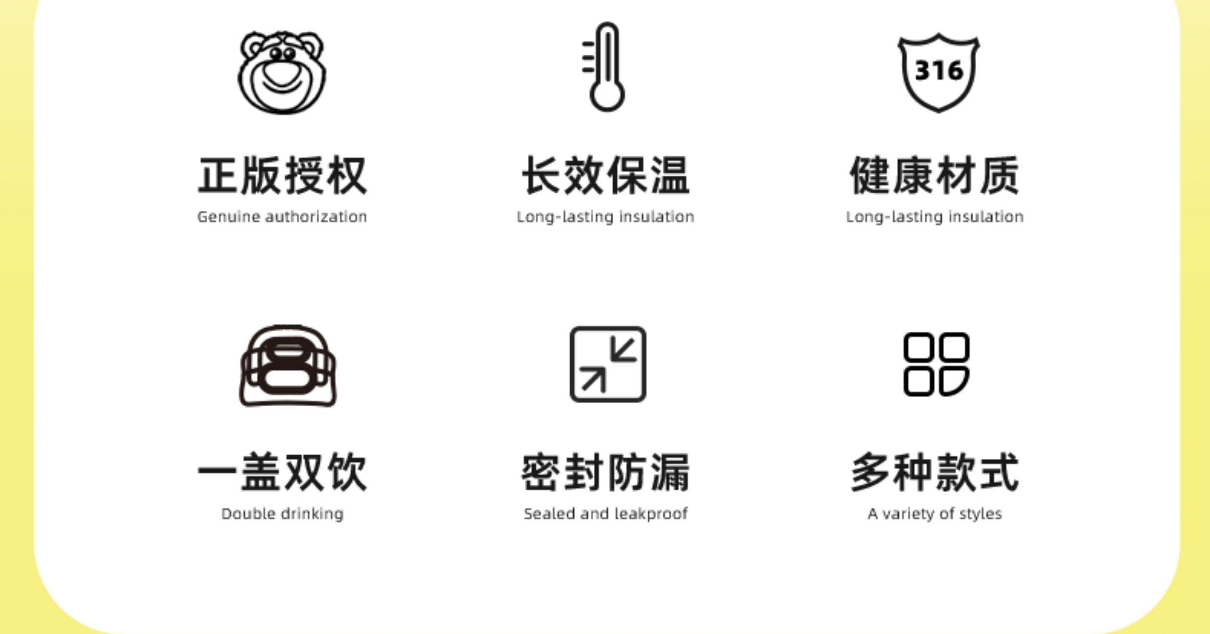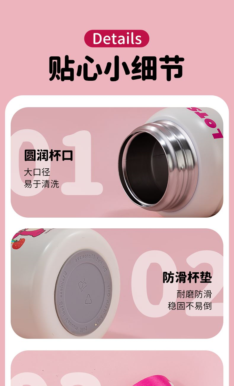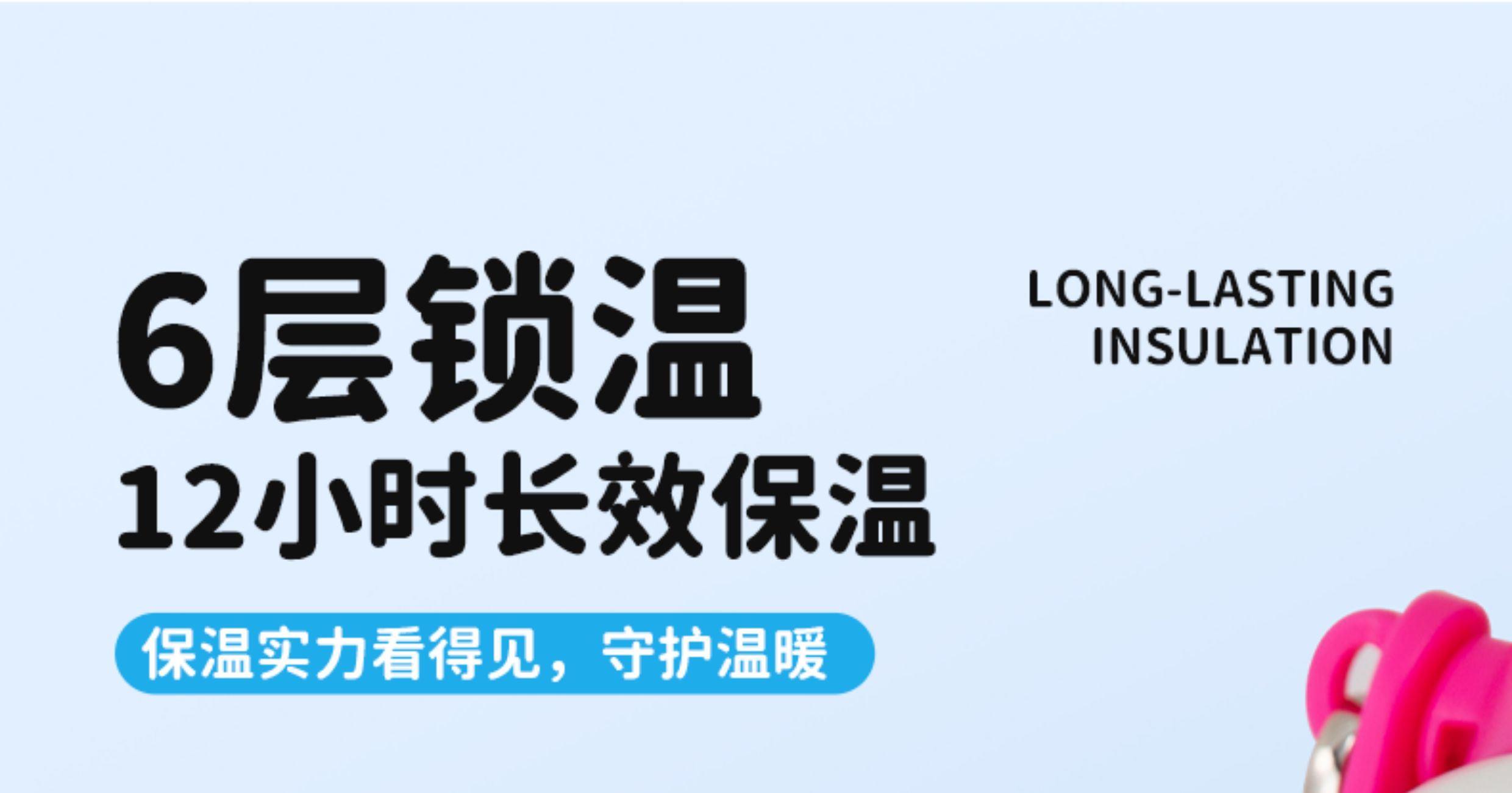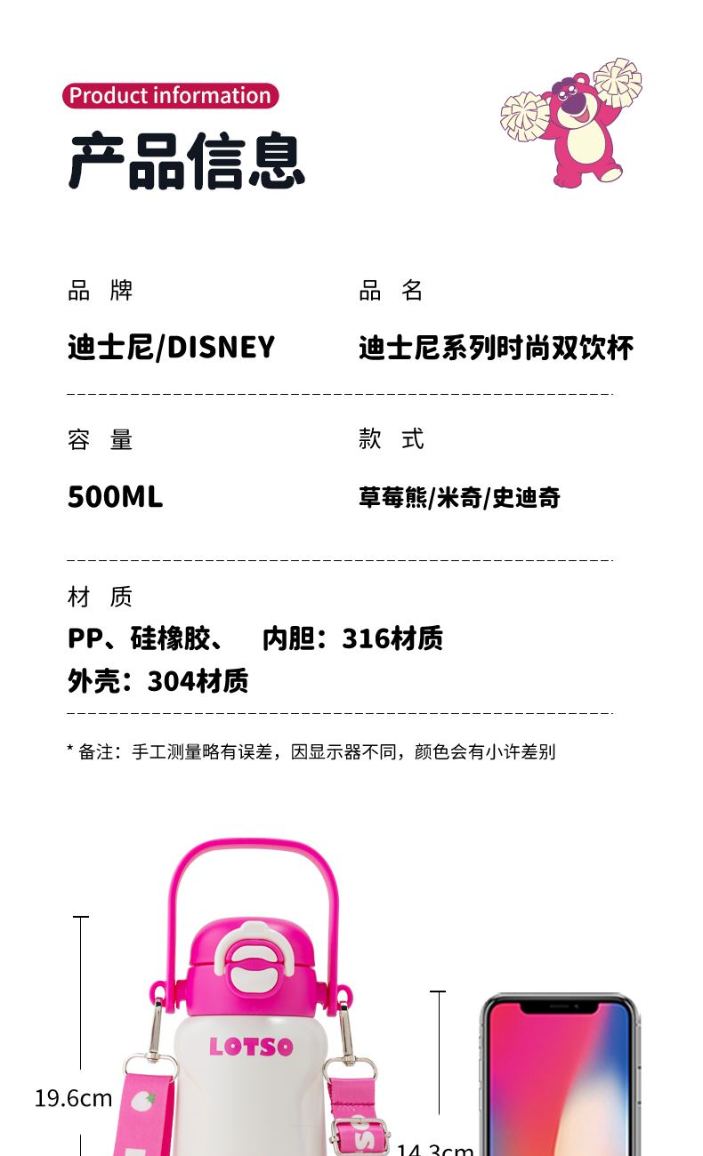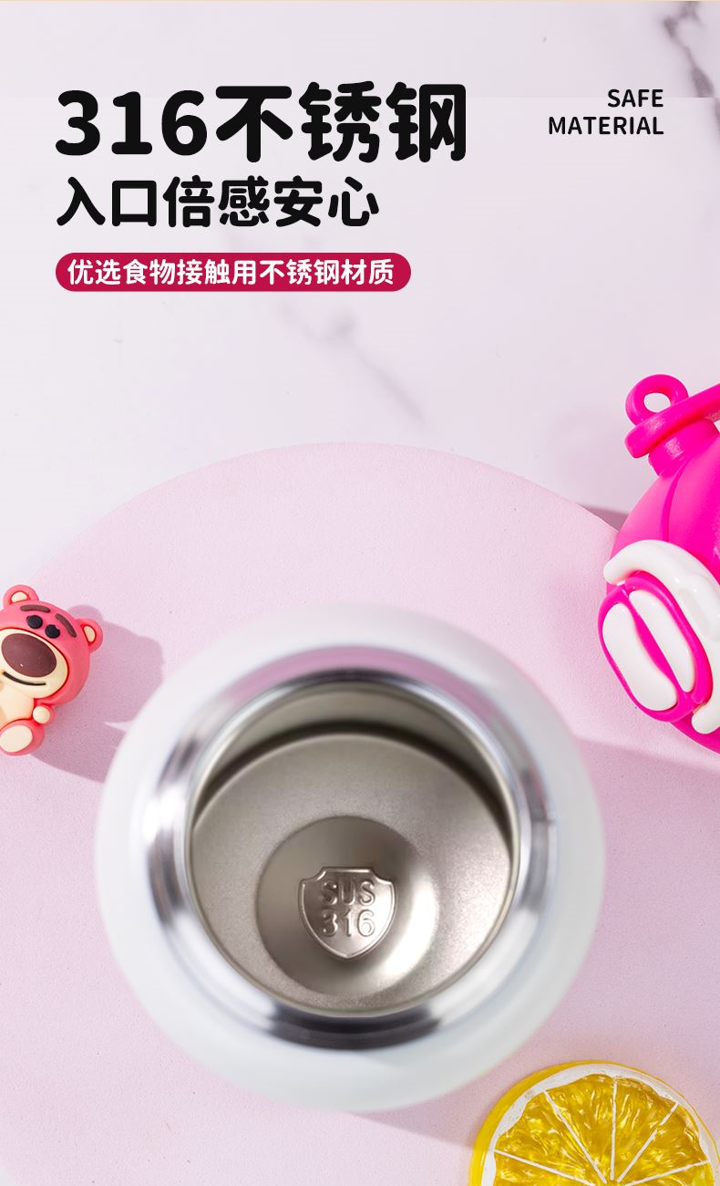 容量:500ml 尺寸:8*8*18.5CM 材质:PP、硅橡胶、内胆:316材质 外壳:304材质 卖点: ①一盖双饮,吸管&直饮不设限 ②密封锁扣,防止误触 ③6层锁温,12小时长效护航 ④316不锈钢入口倍感安心,优选食物接触用不锈钢材质 ⑤便携提手精美背带,可拆卸、一握即轻,便携由心 ⑥密封不漏水360°任意倒置,内置密封防漏圈,有效防漏,安心使用 ⑦圆润杯口、防滑杯垫、背带设计
