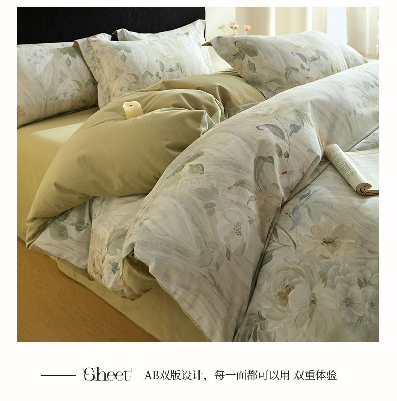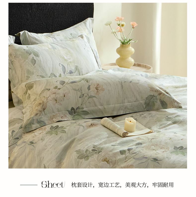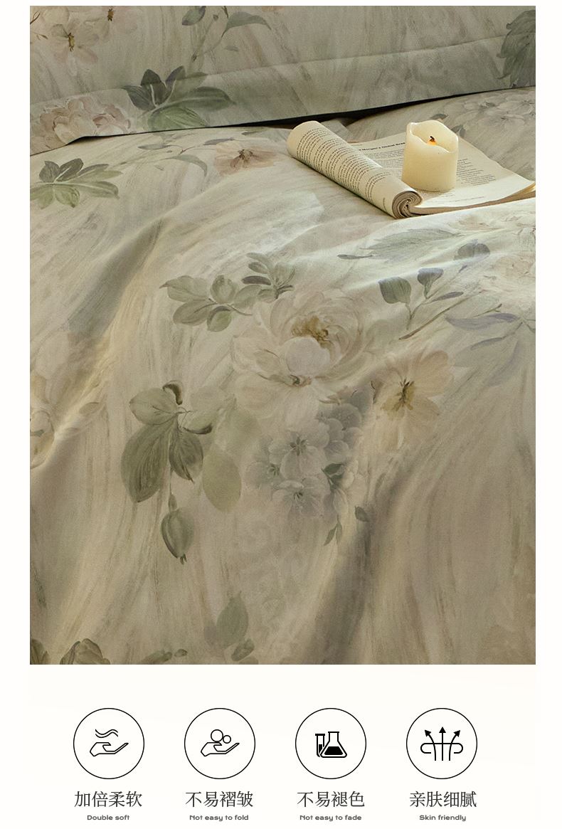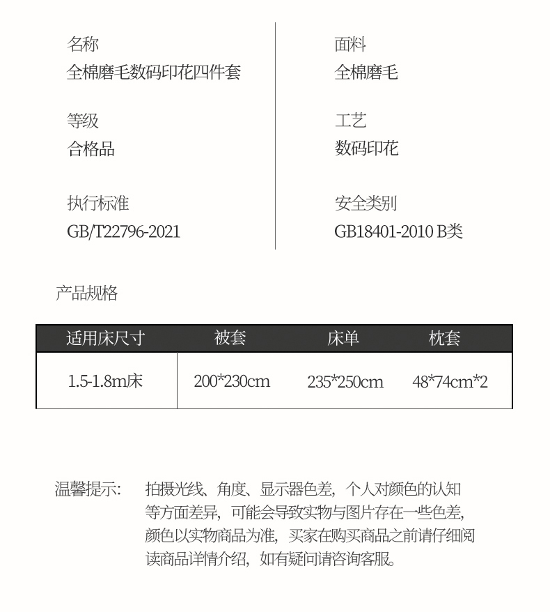 被套:200×230cm 床单:235×250cm 枕套:48×74cm 适用:1.5M-1.8M床 面料:全棉磨毛(棉) 印染工艺:环保印花 款式:贴边圆角款 数码全棉磨毛面料,贴合肌肤零距离,顺滑柔软保暖性好,给予肌肤软糯触感,数码印花工艺每一个角度色感与质感俱佳颜色均匀不易褪色是它历久弥新。