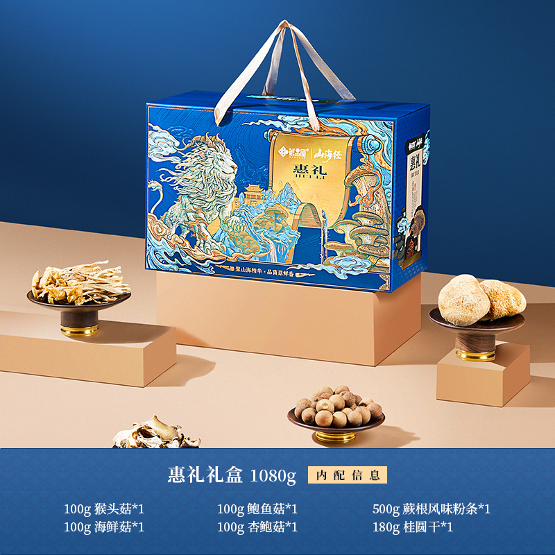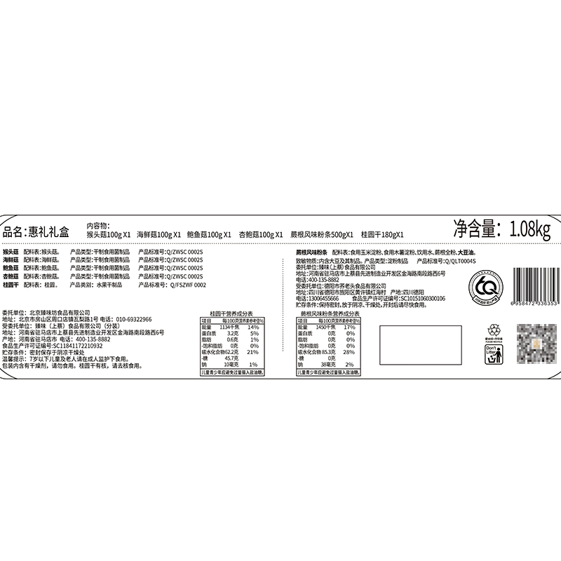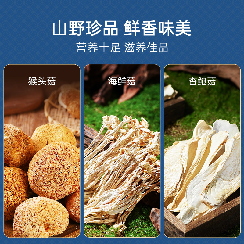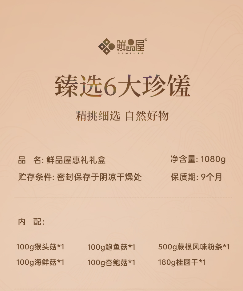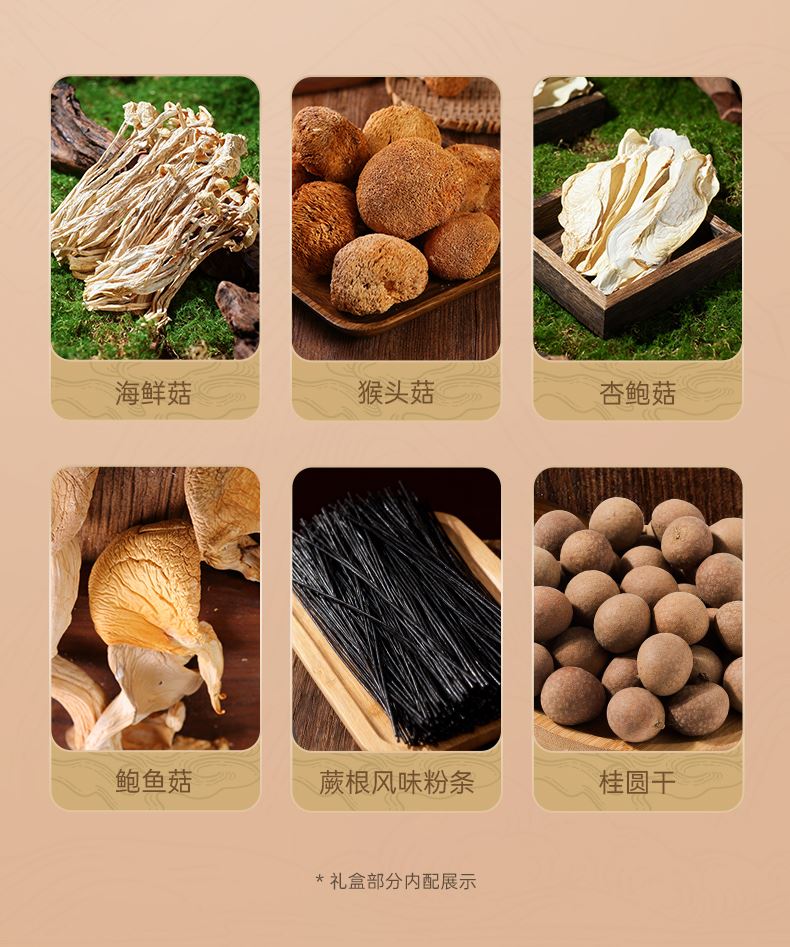 100g猴头菇*1 100g海鲜菇*1 100g鲍鱼菇*1 100g杏鲍菇*1 500g蕨根风味粉条*1 180g桂圆干*1