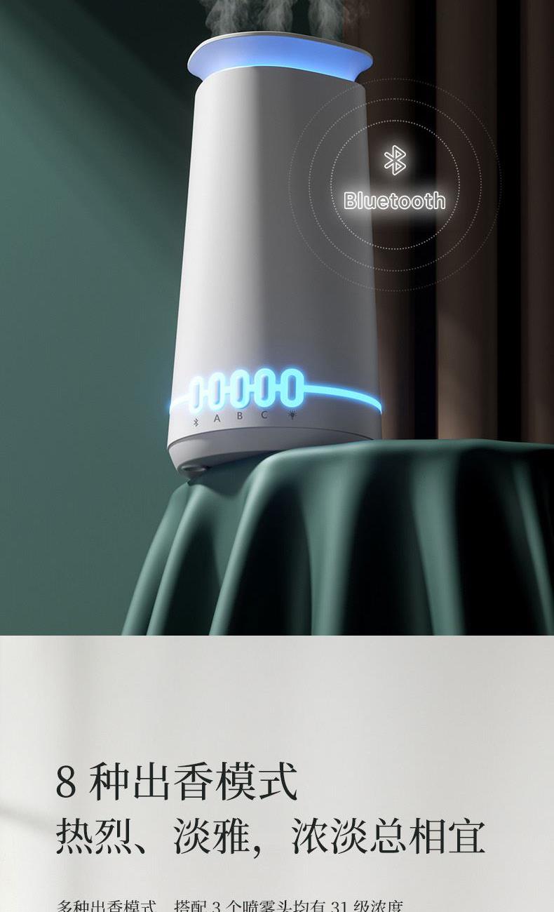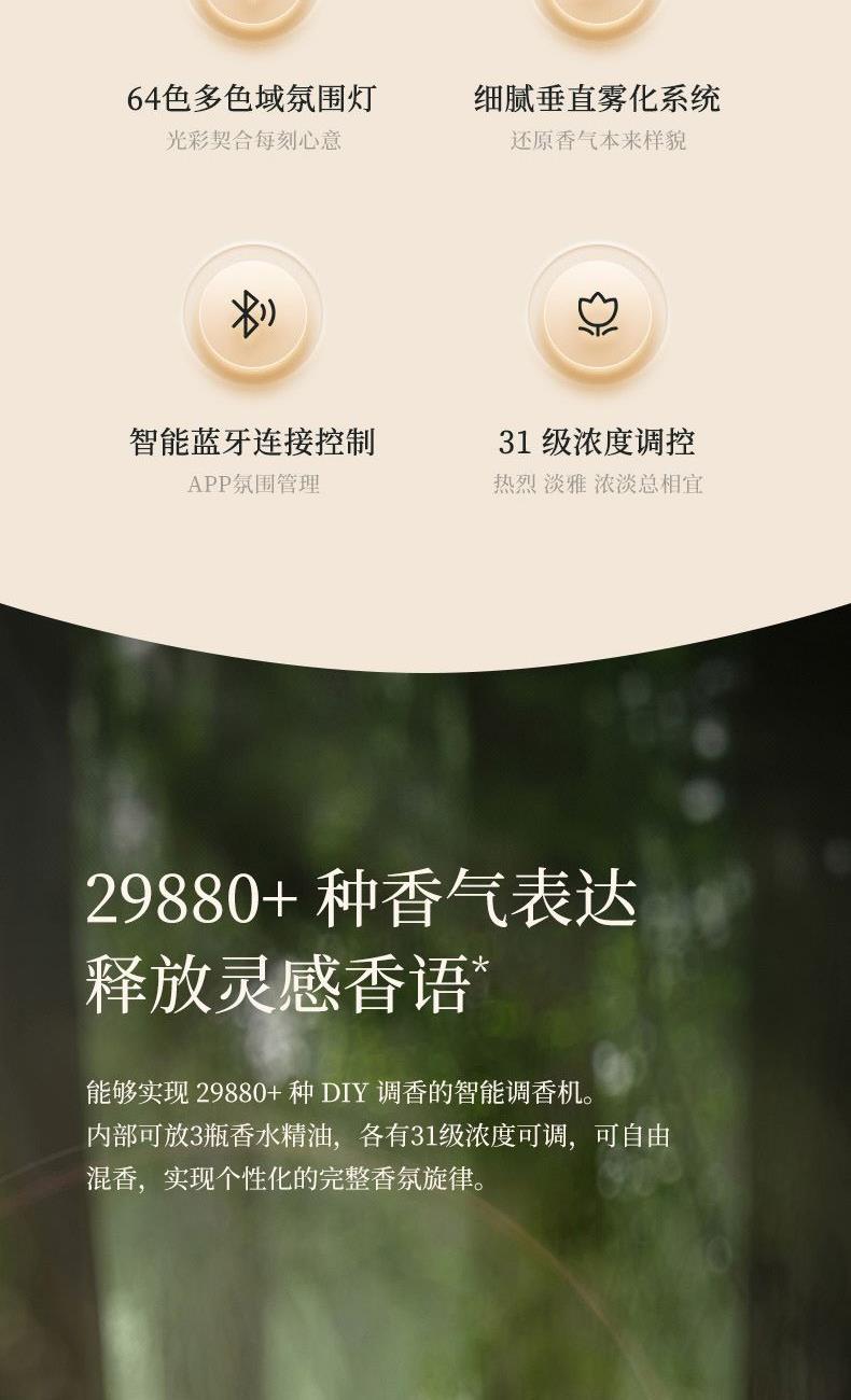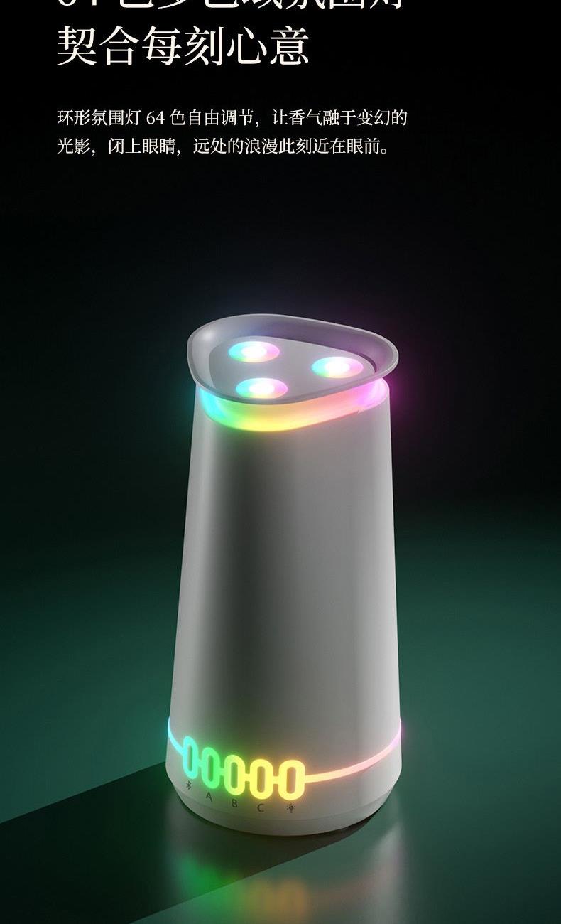 颜色:白色 供电方式:Type-C充电 电池容量:2400mAh 主机包装:20.5*11.3*11.3cm/450g 外箱尺寸:58.5*36*42.5cm/30台/14kg 精油包装:3*3*10.5cm/45ml/48g 精油外箱:31*31*11.5cm/100瓶/5.5kg 产品标配:彩盒、主机、精油(45ml)*3、说明书、数据线 64色多域氛围灯,8种出香模式 智能蓝牙连接,APP自由香氛管理 配纯天然植物活萃植物香氛精油,安全可靠,母婴可用 多采氛围灯,适合居家、办公等多场合适用"