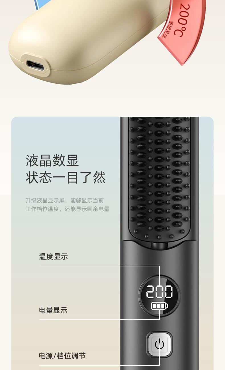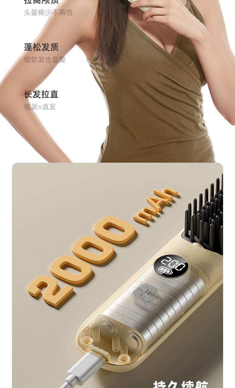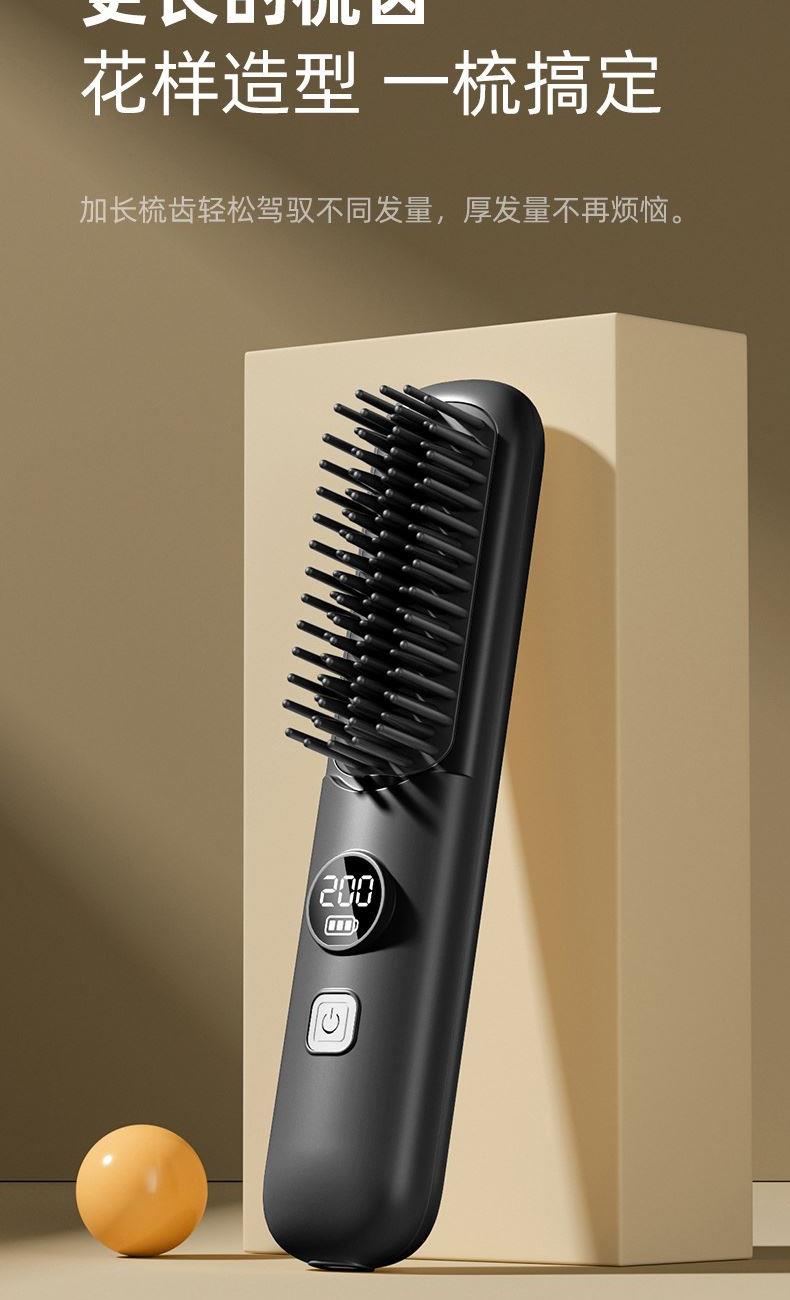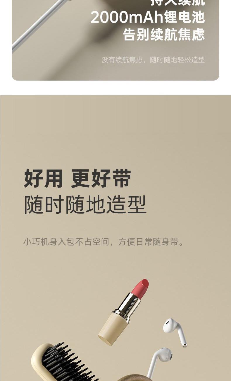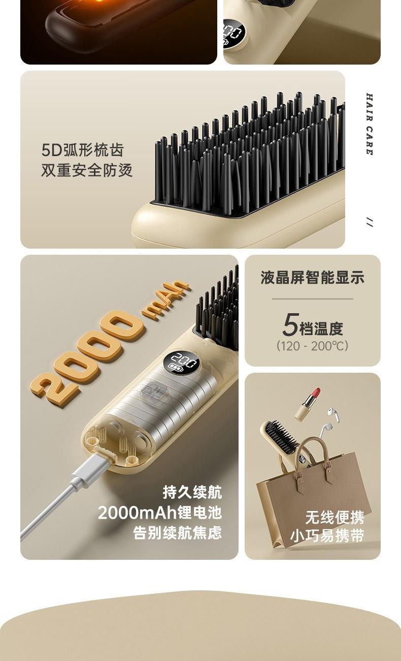 颜色:白色、黑色、粉色、渐变色 供电方式:磁吸充电 电池容量:2000mAh 主机包装:21*12*5cm/326g 外箱尺寸:44*38*27cm/30台/11kg 产品标配:彩盒、主机、说明书、数据线、底座 水润护发抚平毛躁,深层滋透发丝 5档快速均匀发热,恒温造型 5D交错梳齿,内外双重防烫 内置电池,磁吸底座充电"