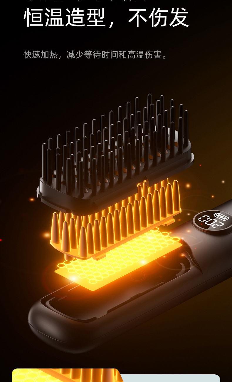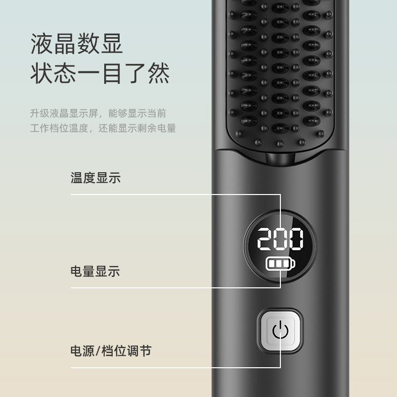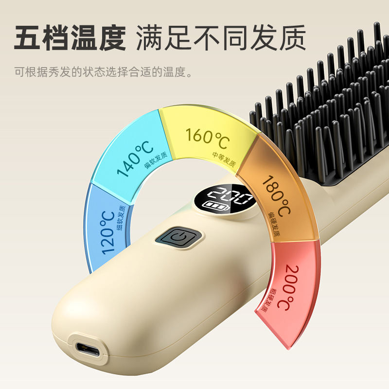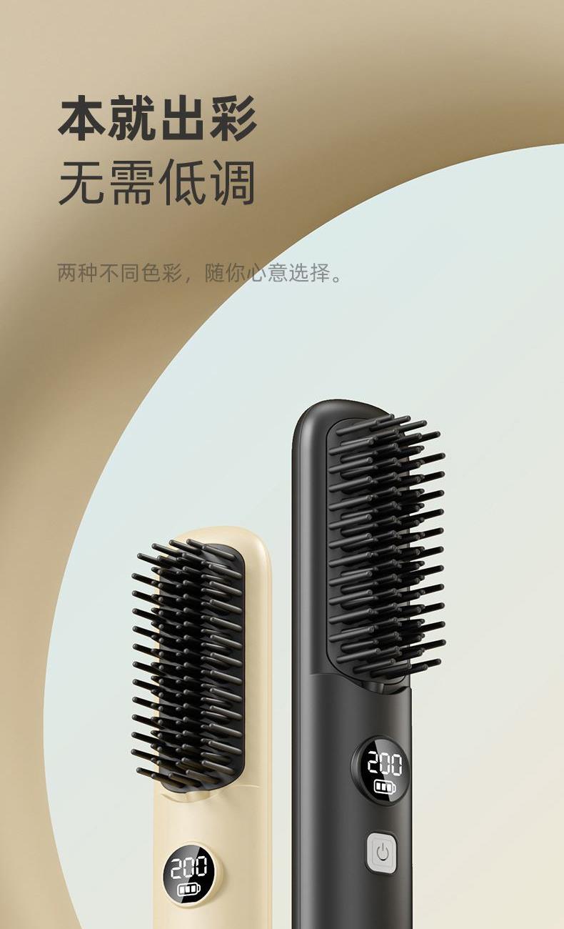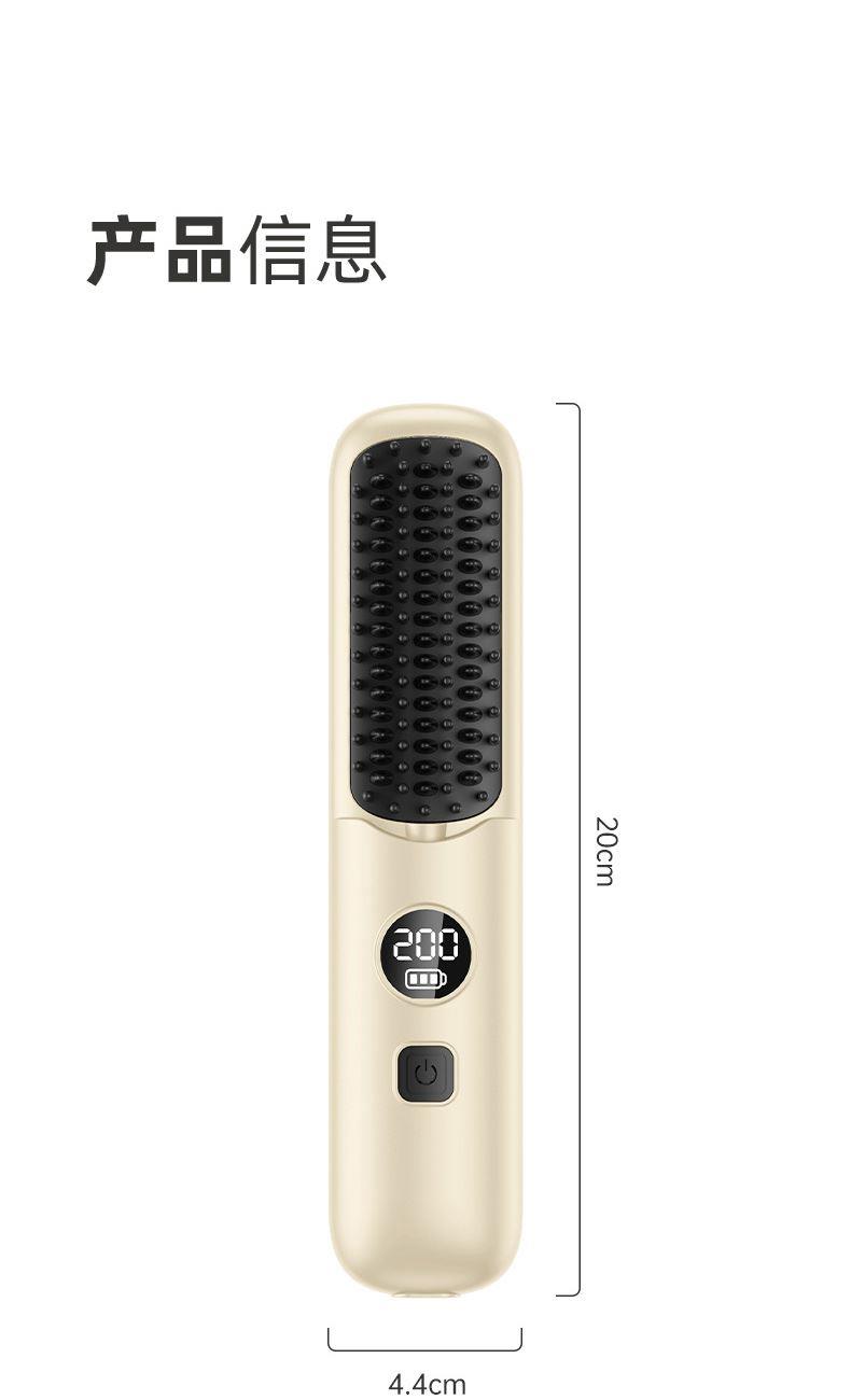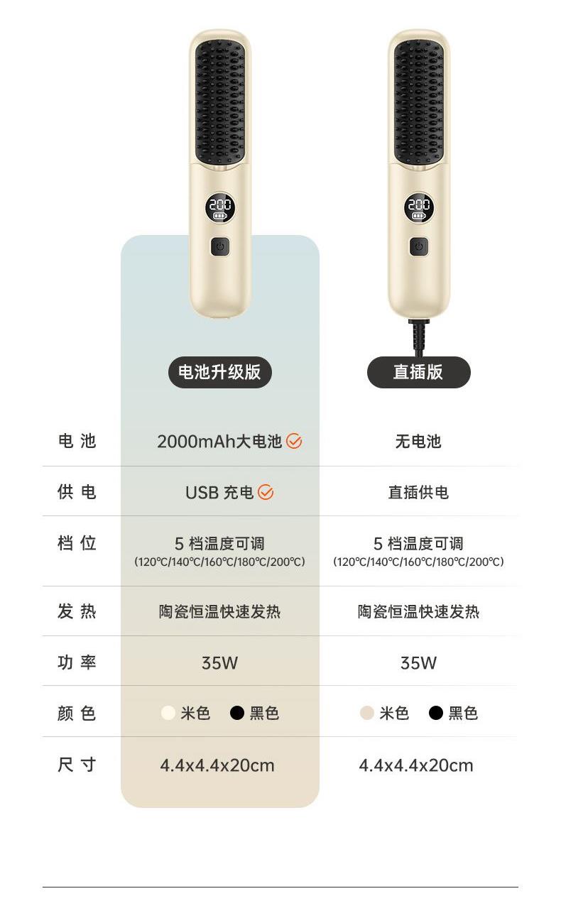 颜色:白色、黑色、粉色、渐变色 供电方式:磁吸充电 电池容量:2000mAh 主机包装:21*12*5cm/326g 外箱尺寸:44*38*27cm/30台/11kg 产品标配:彩盒、主机、说明书、数据线、底座 水润护发抚平毛躁,深层滋透发丝 5档快速均匀发热,恒温造型 5D交错梳齿,内外双重防烫 内置电池,磁吸底座充电"