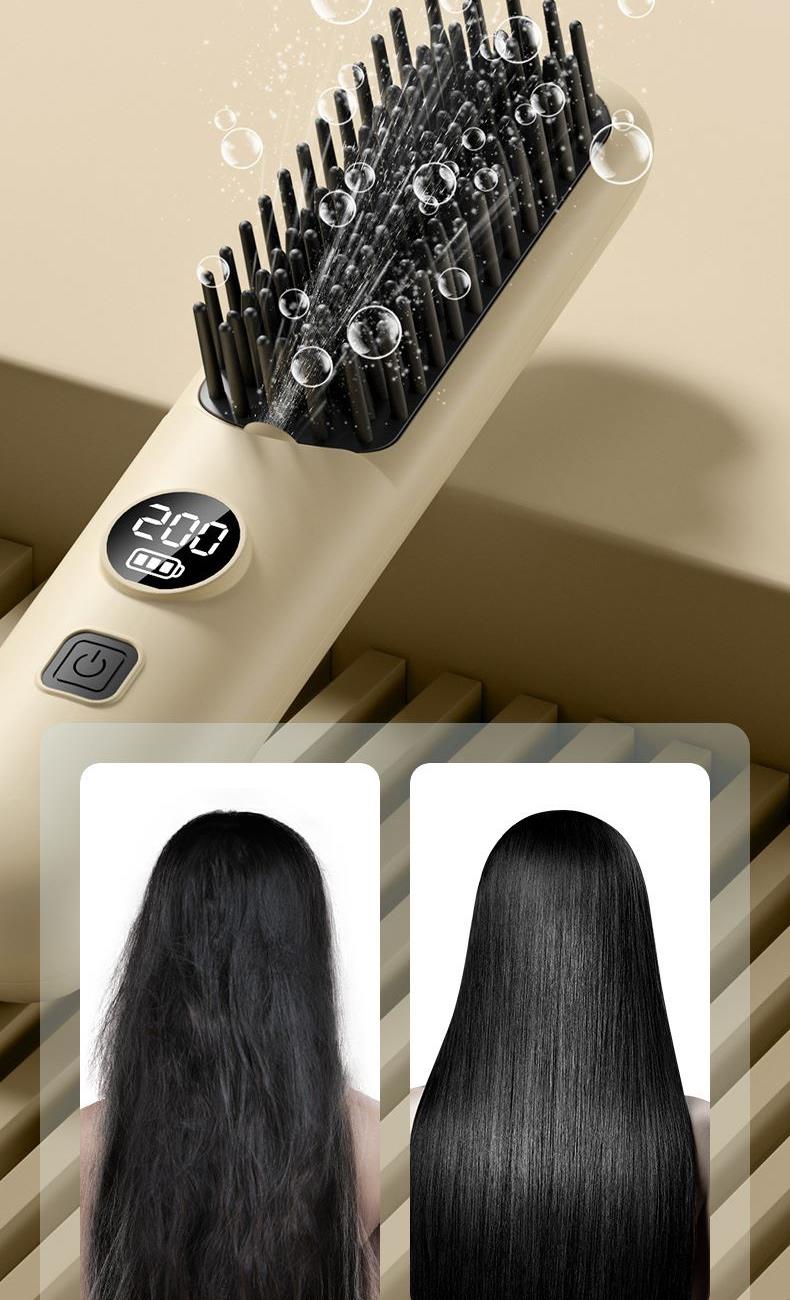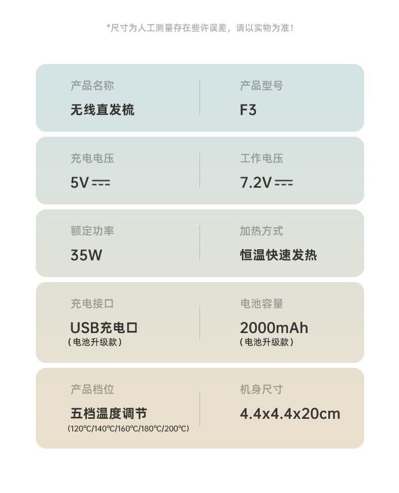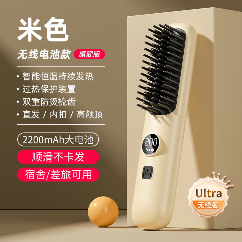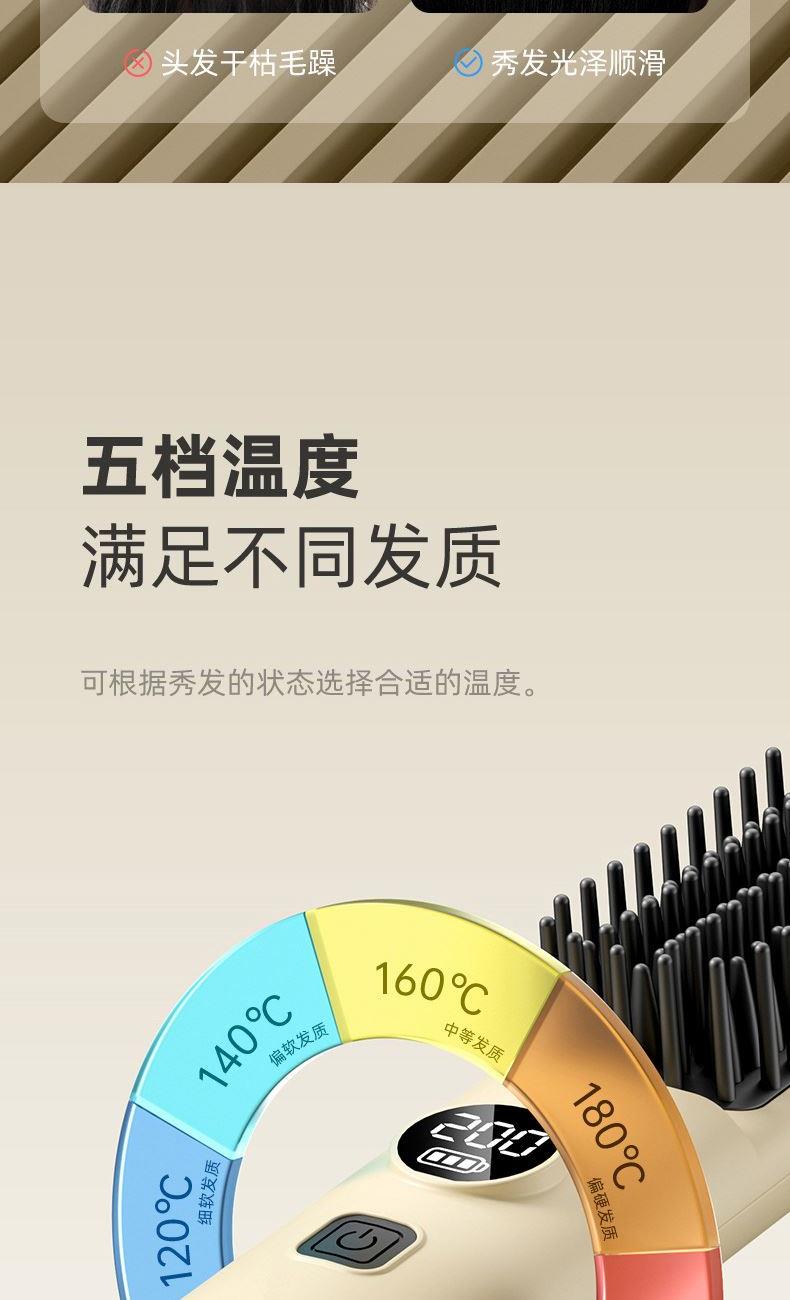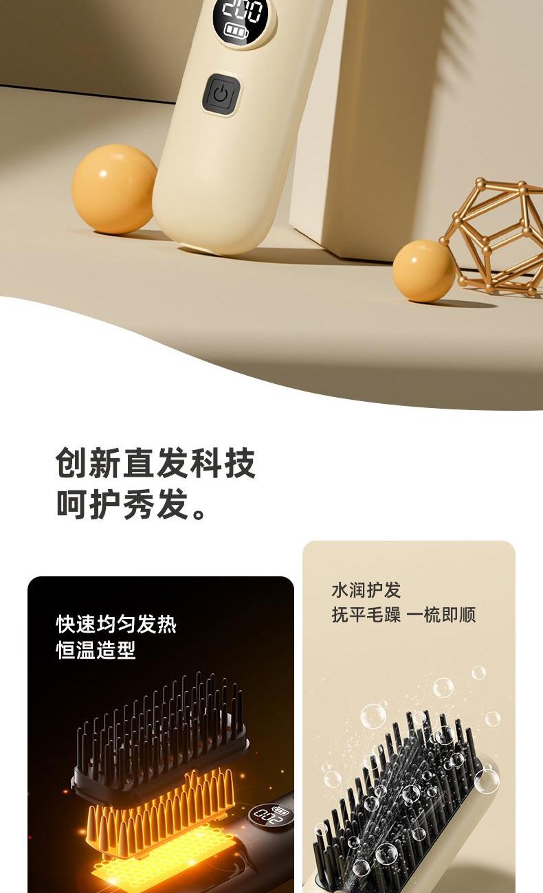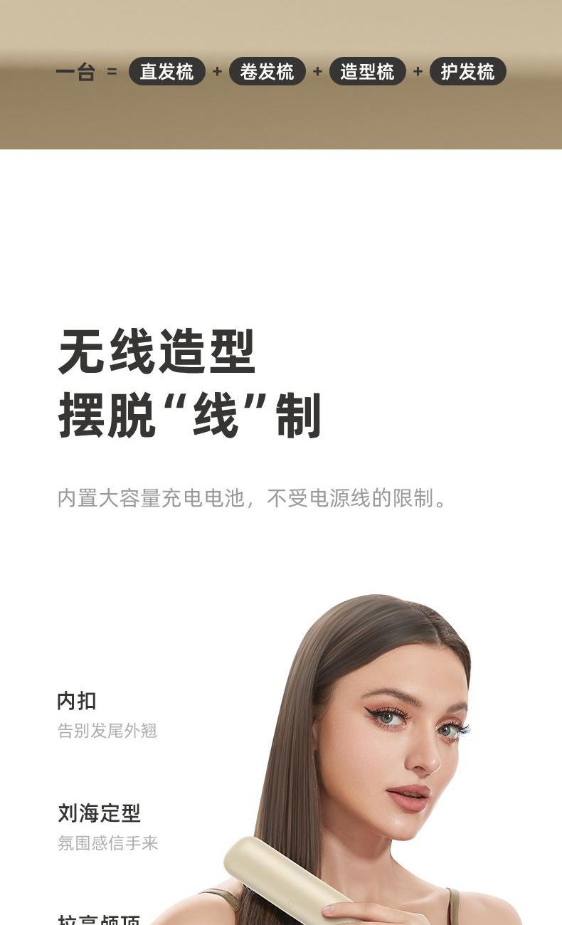 颜色:白色、黑色、粉色、渐变色 供电方式:磁吸充电 电池容量:2000mAh 主机包装:21*12*5cm/326g 外箱尺寸:44*38*27cm/30台/11kg 产品标配:彩盒、主机、说明书、数据线、底座 水润护发抚平毛躁,深层滋透发丝 5档快速均匀发热,恒温造型 5D交错梳齿,内外双重防烫 内置电池,磁吸底座充电"