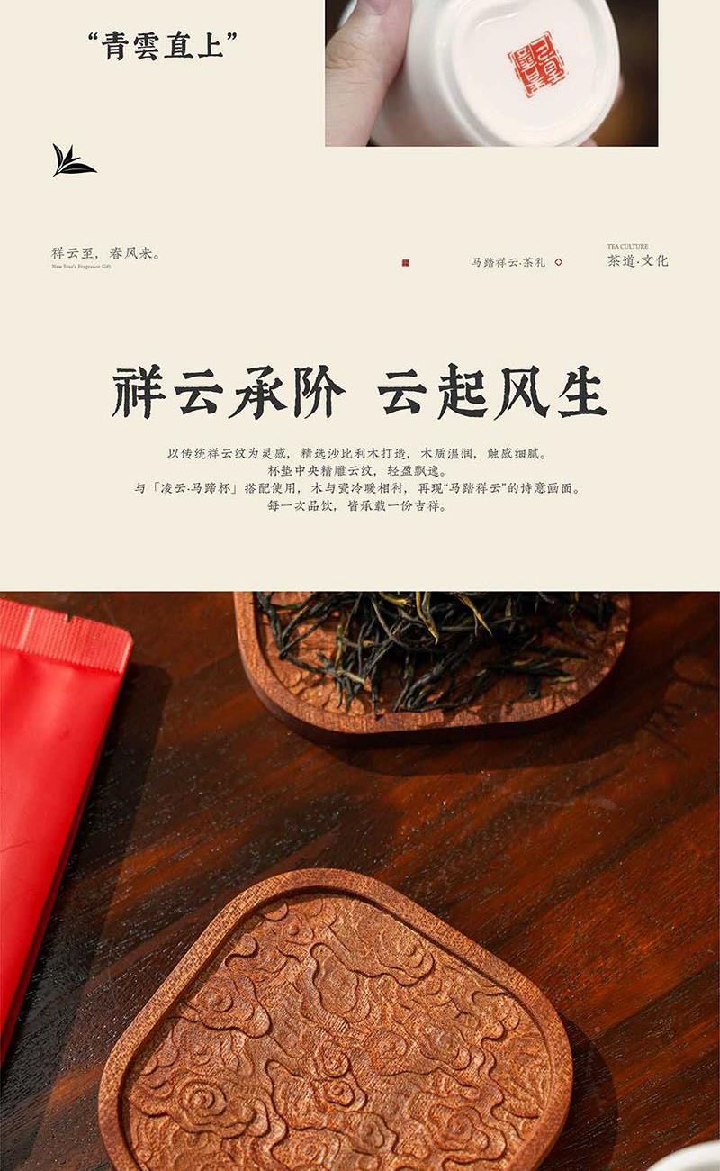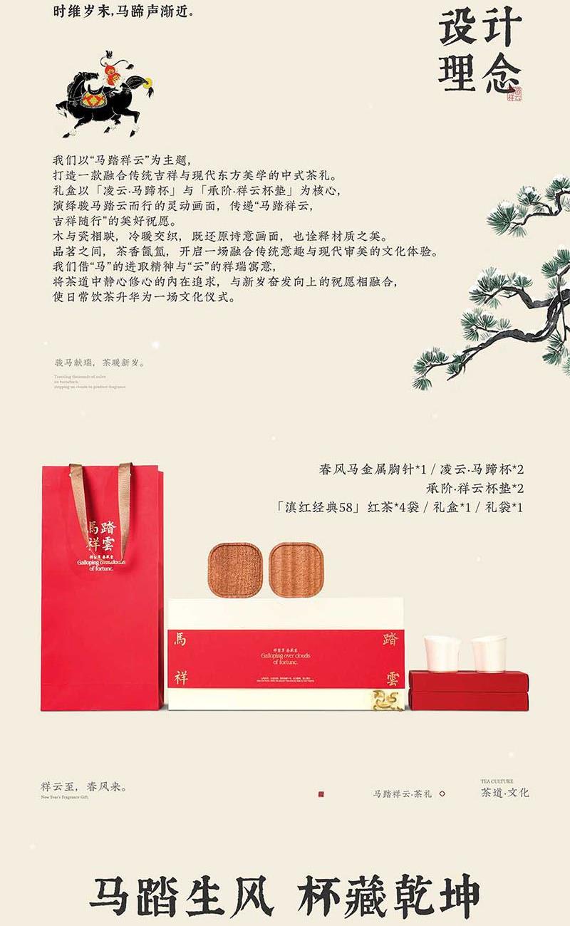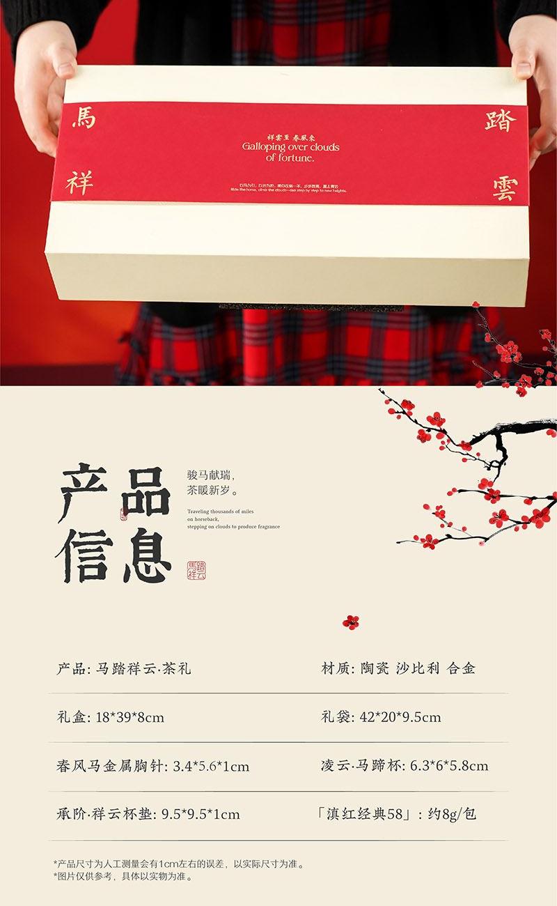 礼盒清单 春风马金属胸针*1 凌云·马蹄杯*2 承阶·祥云杯垫*2 「滇红经典58」红茶*4袋 礼盒*1 礼袋*1 产品信息 产品 / Product Mini 马踏祥云·茶礼 材质 / Material 陶瓷 沙比利 合金 规格 / Size 礼盒:39*18*8cm 礼袋:42*20*9.5cm 春风马金属胸针:φ18.3*h2.1cm 凌云·马蹄杯:5.8*6*6.3cm 承阶·祥云杯垫:9.5*9.5*1cm 「滇红经典58」:约8g